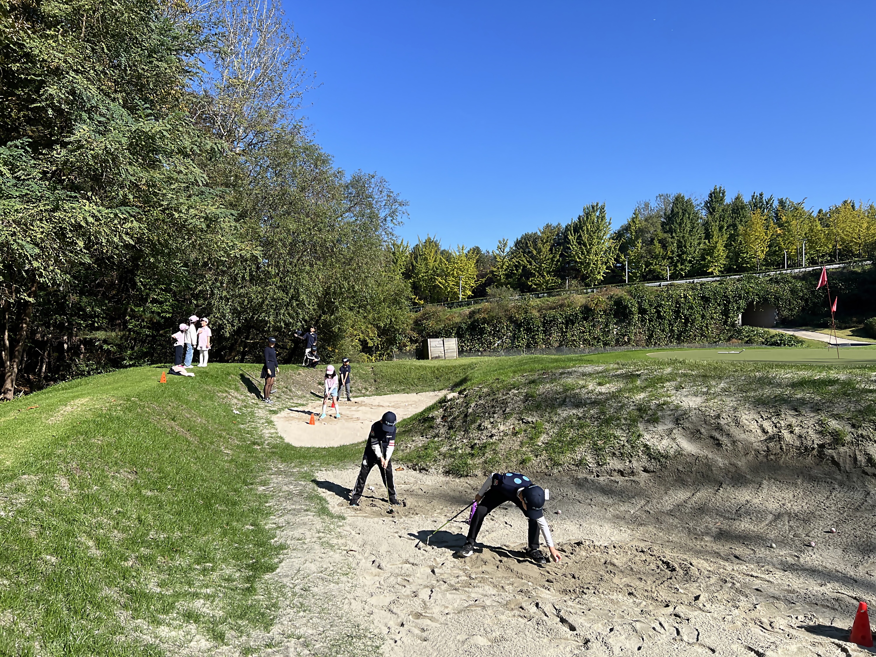 벙커 탈출을 위한 1:1 개별 레슨을 마친 후 조별로 벙커샷 연습을 하고 있는 모습