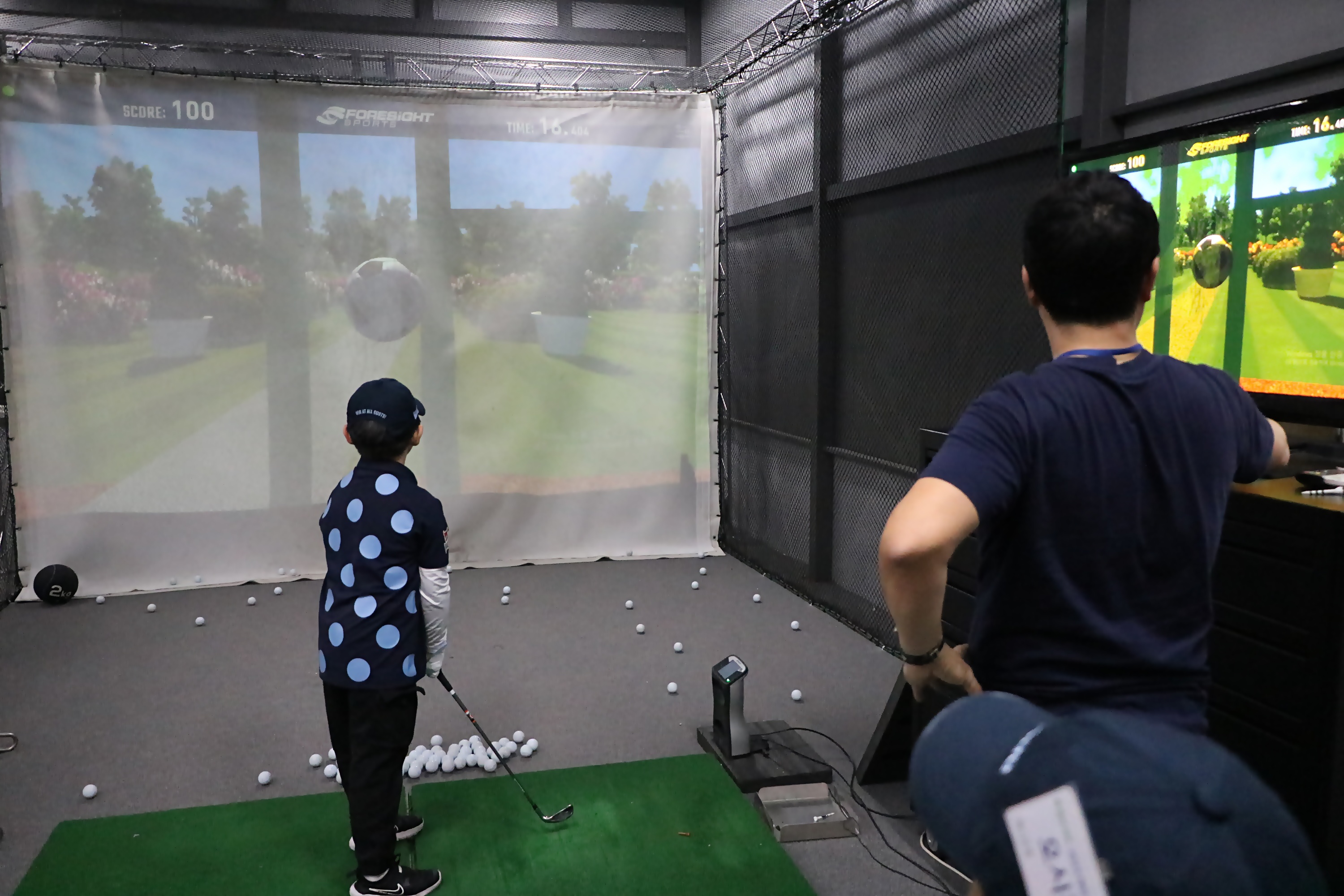 골프공으로 유리창 깨기 게임을 체험해 보고 있는 아이들