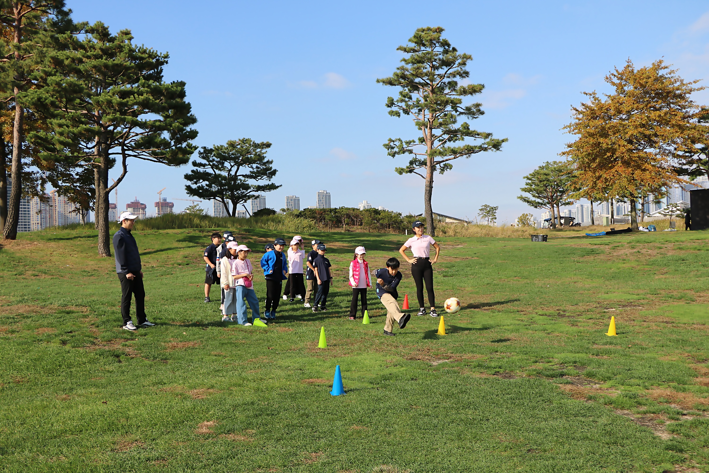 몸풀기 시간에 양팀으로 나뉘어 발야구를 하며 즐거운 시간을 보내고 있는 아이들