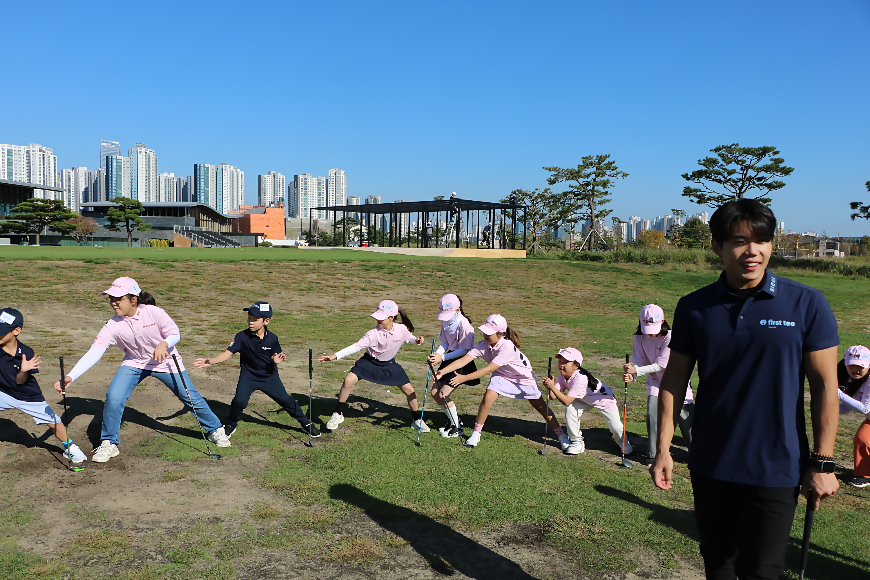 몸풀기로 순발력과 민첩성을 기르기 위한 클럽잡기 놀이를 하며 즐거워 하고 있는 아이들