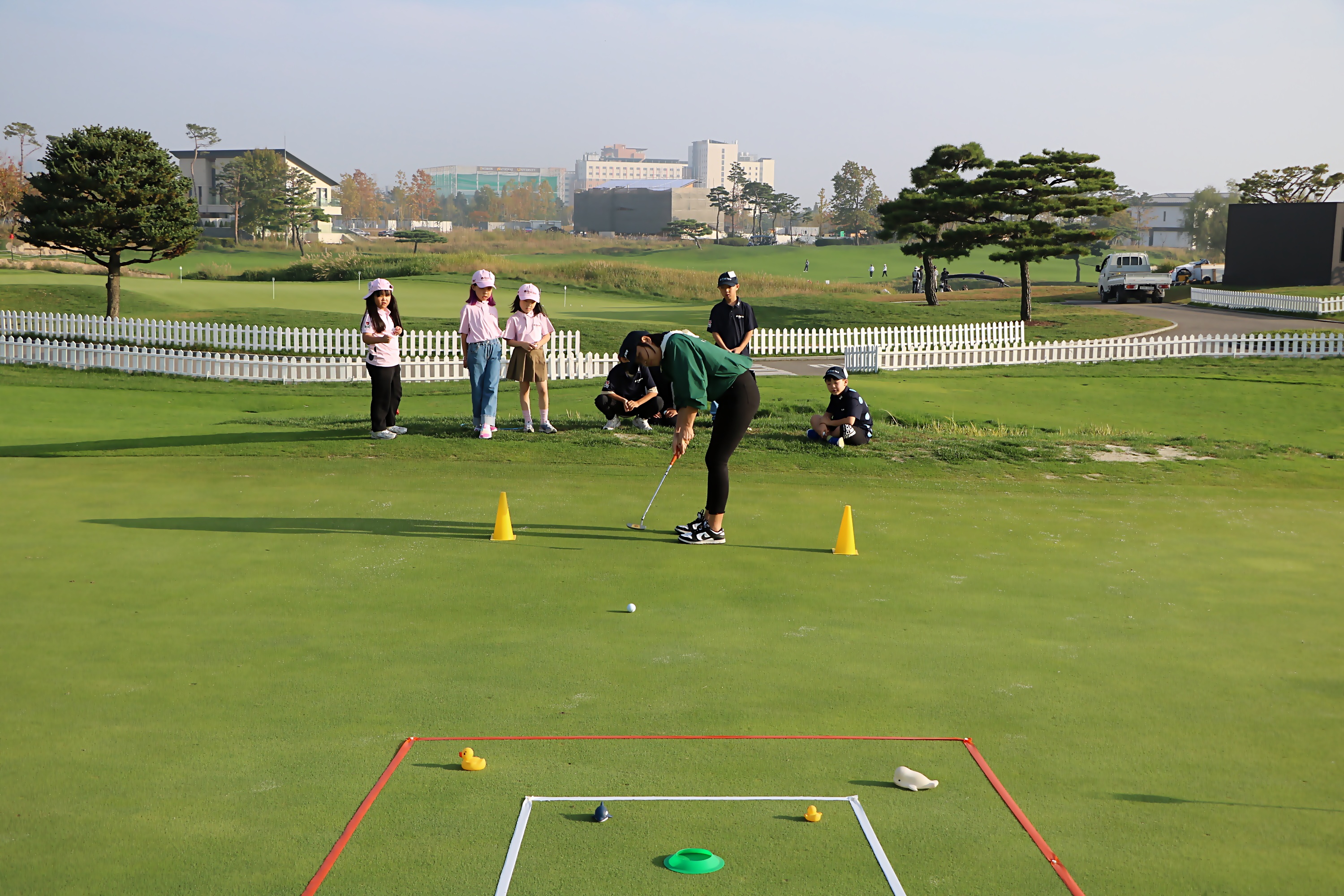 퍼팅 게임을 앞두고 경기방식을 직접 시범을 통해 설명해 주고 있는 모습