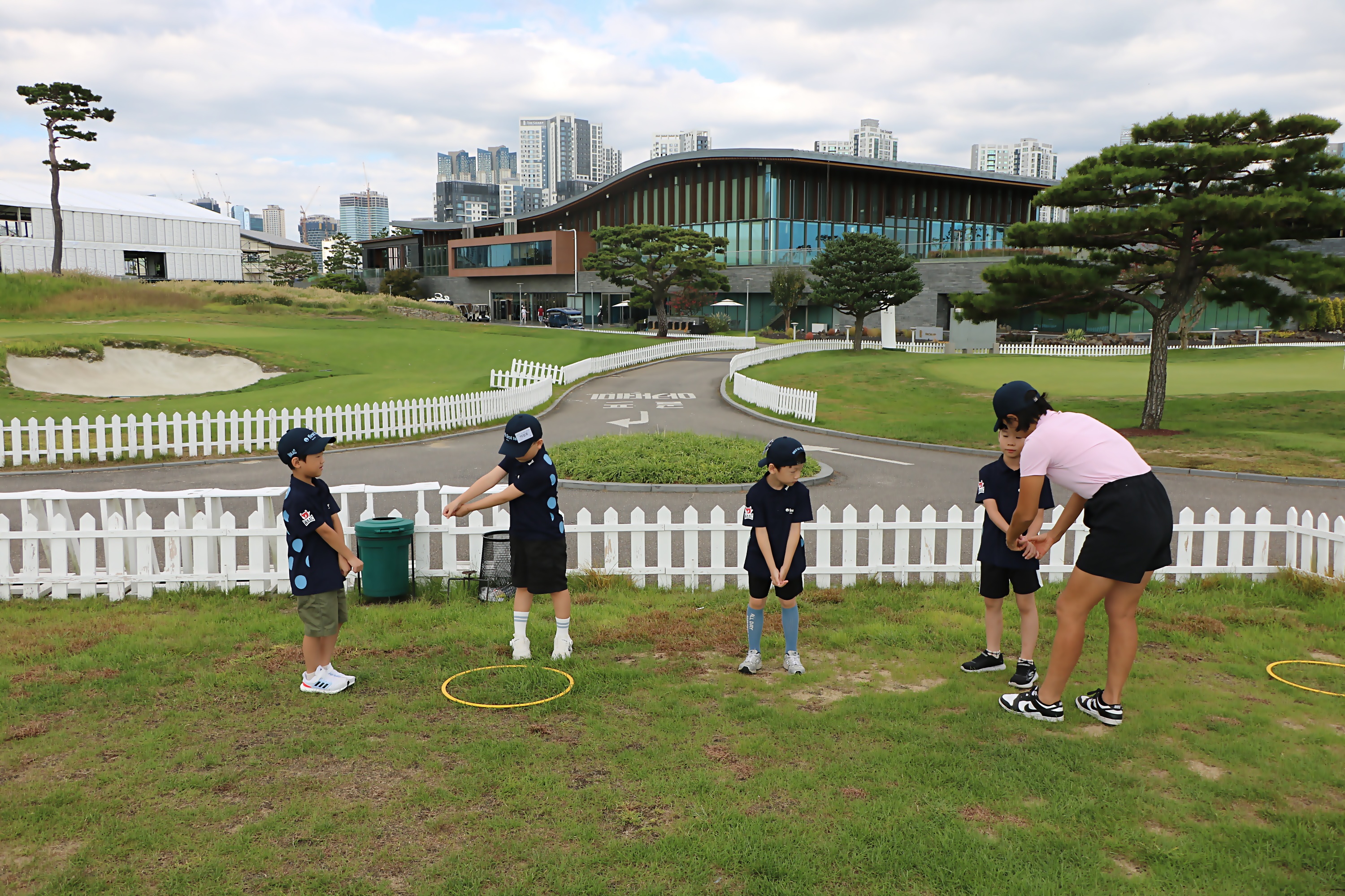 골프실습에 앞서 그동안 배운 Y TO Y 스윙동작을 점검해 보고 있는 아이들