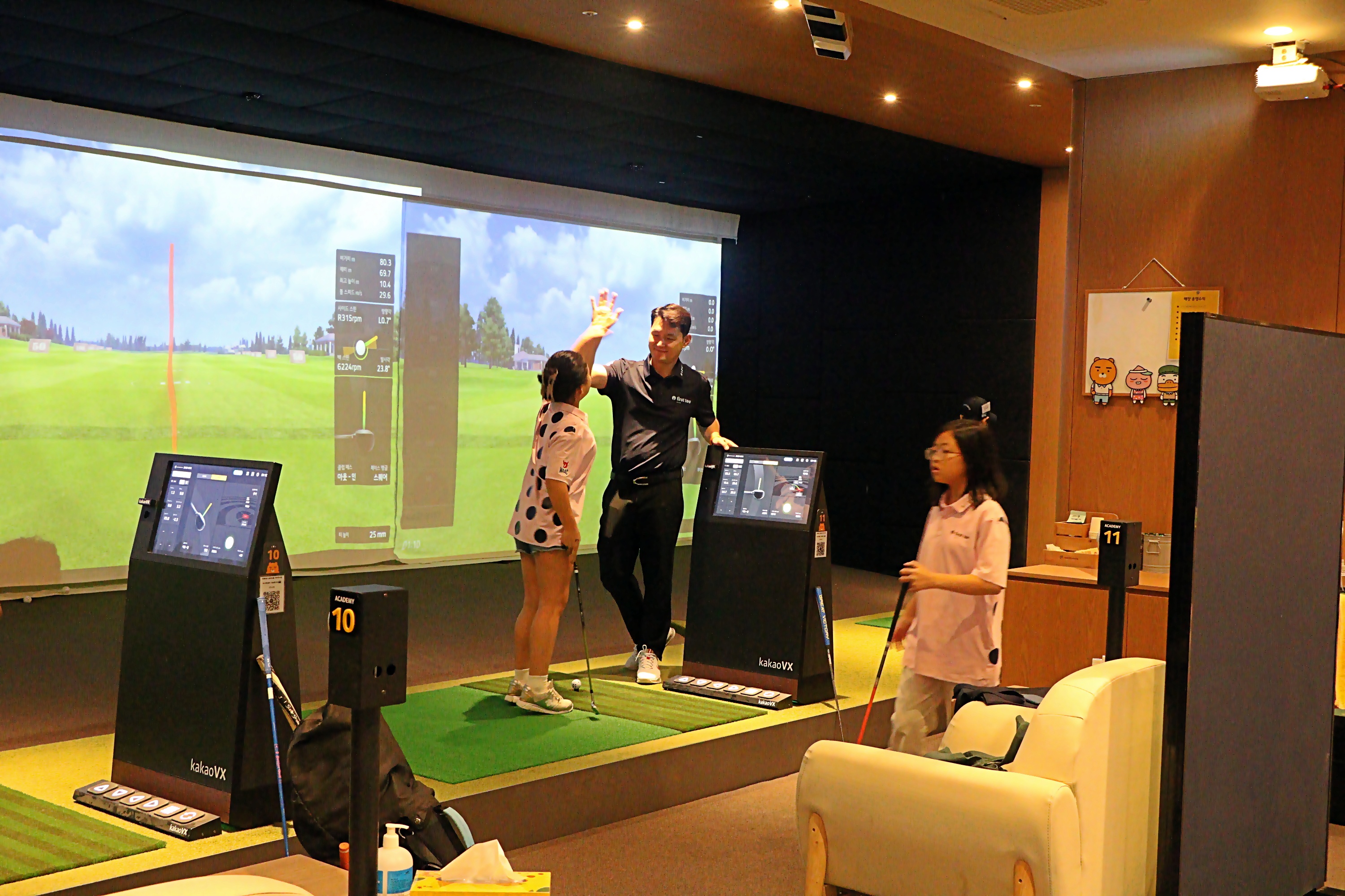 원포인트 레슨 후 향상된 골프샷 결과에 대해 교육생과 하이파이브를 하며 격려해주고 있는 모습