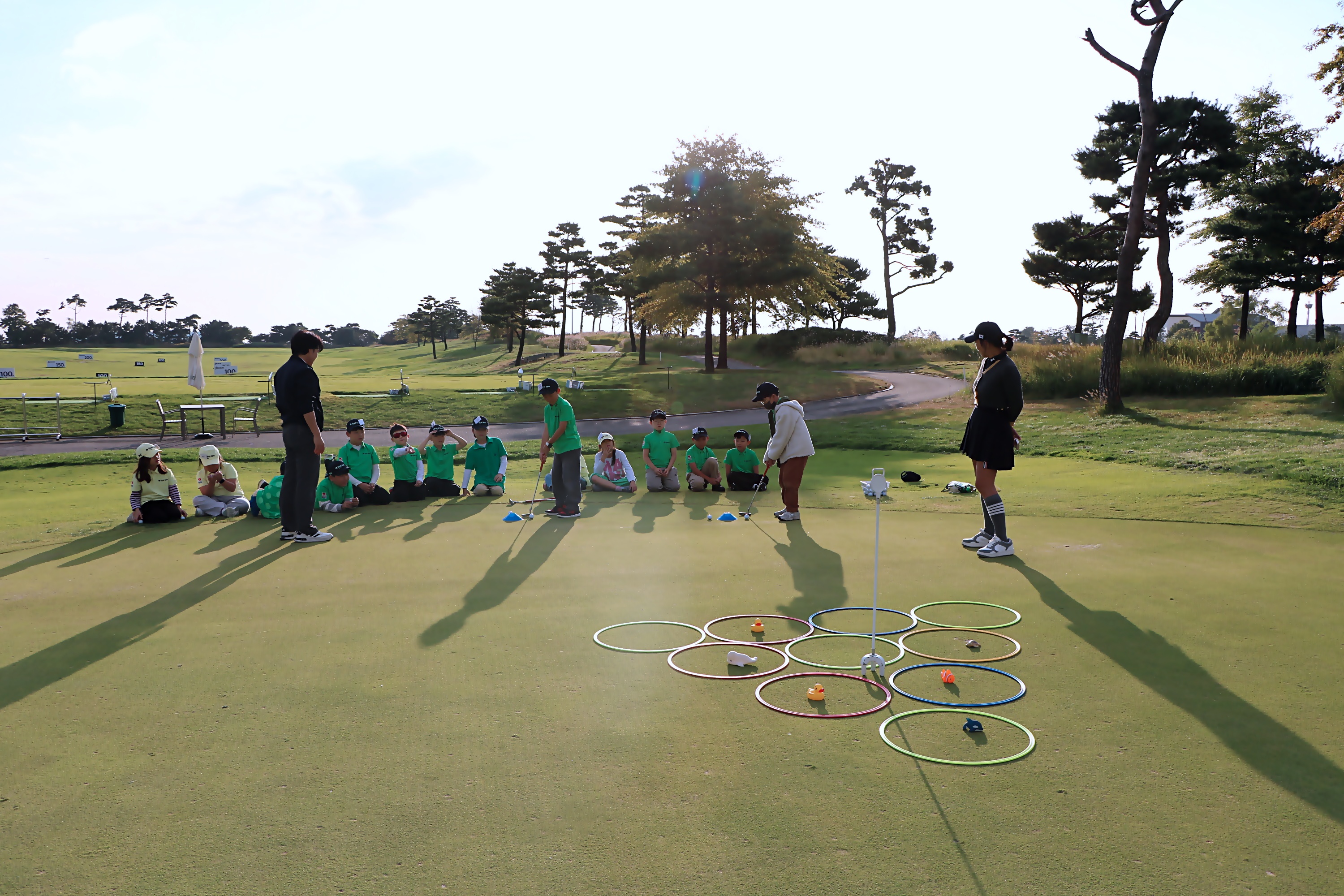 질서정연하게 2인 1조로 퍼팅 실습을 하고 있는 아이들