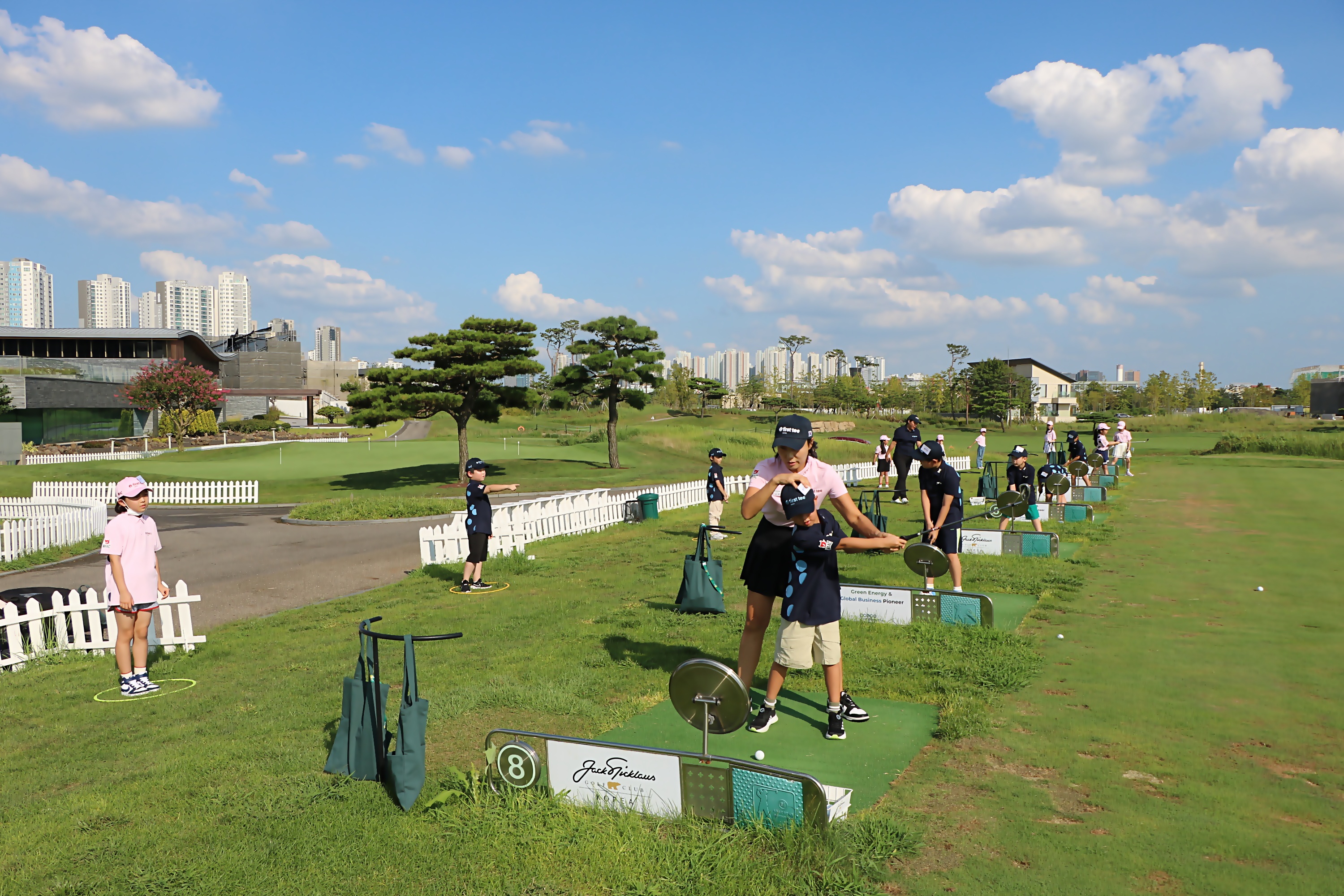 2인 1조로 안전하게 골프실습을 하고 있는 아이들