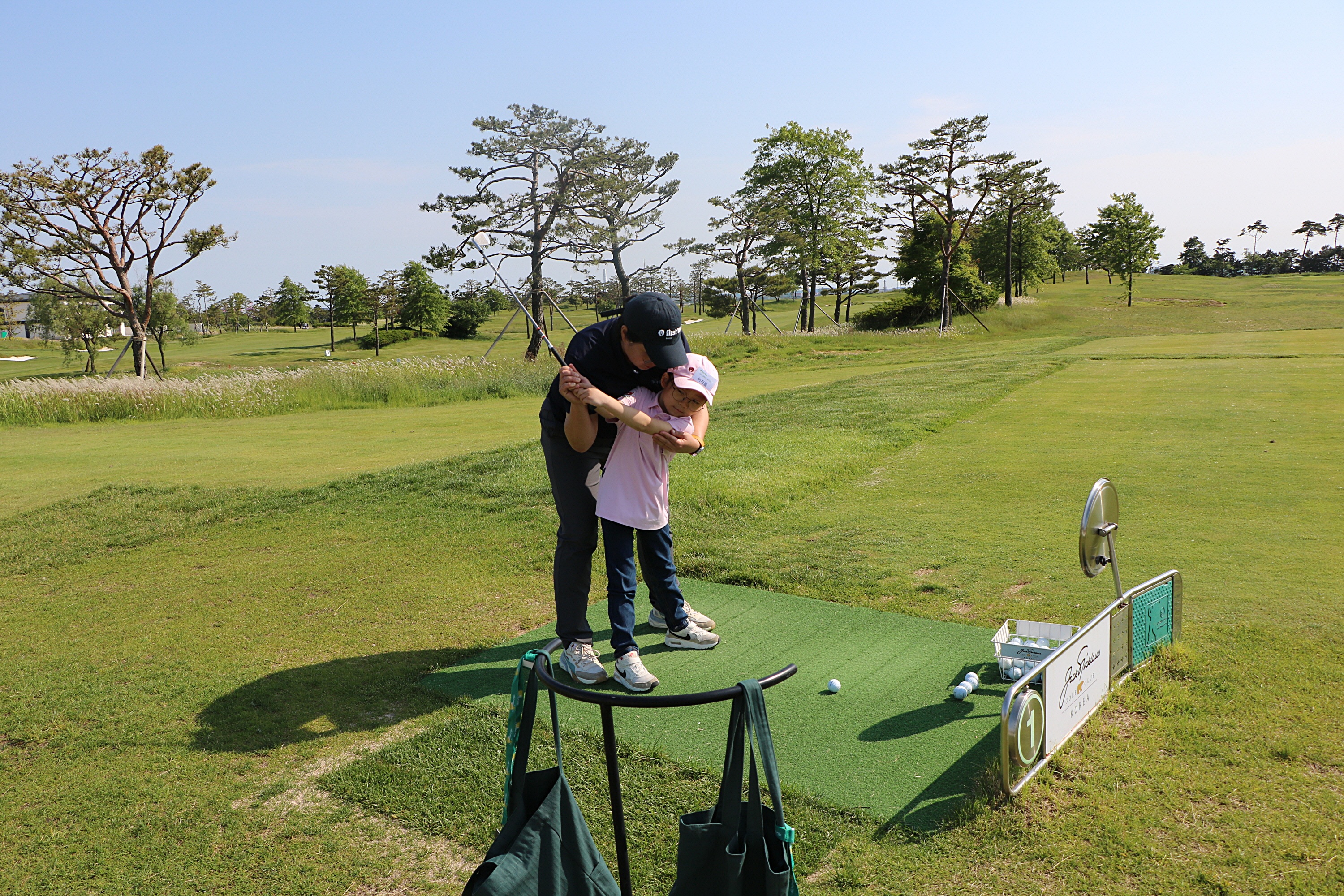 백스윙시 왼쪽 팔꿈치를 굽히지 않도록 교정해 주고 있는 모습