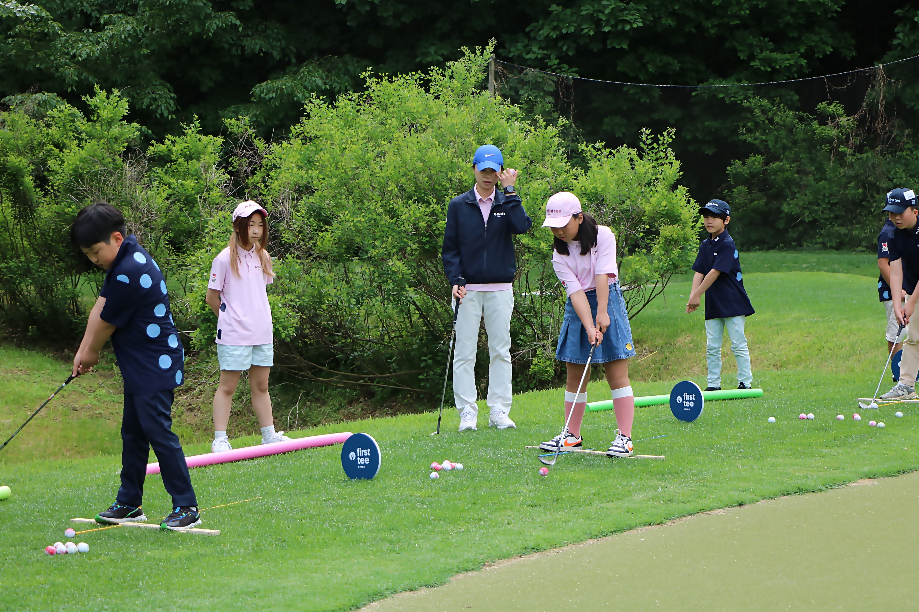 2인 1조로 교대로 어프로치샷 연습을 하고 있는 아이들