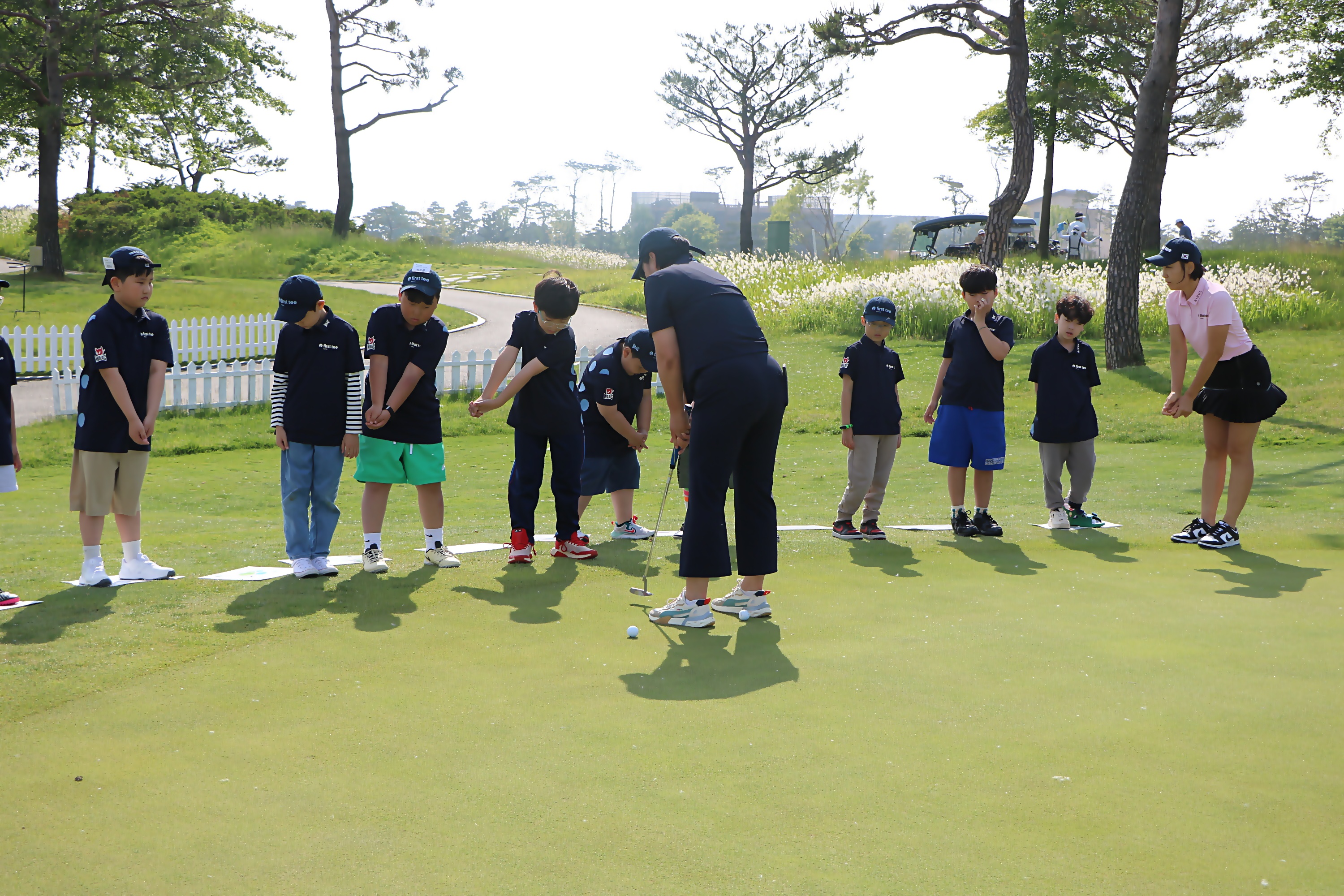 퍼팅과 일반아이언샷의 스윙하는 방법의 차이점을 설명해 주고 있는 모습