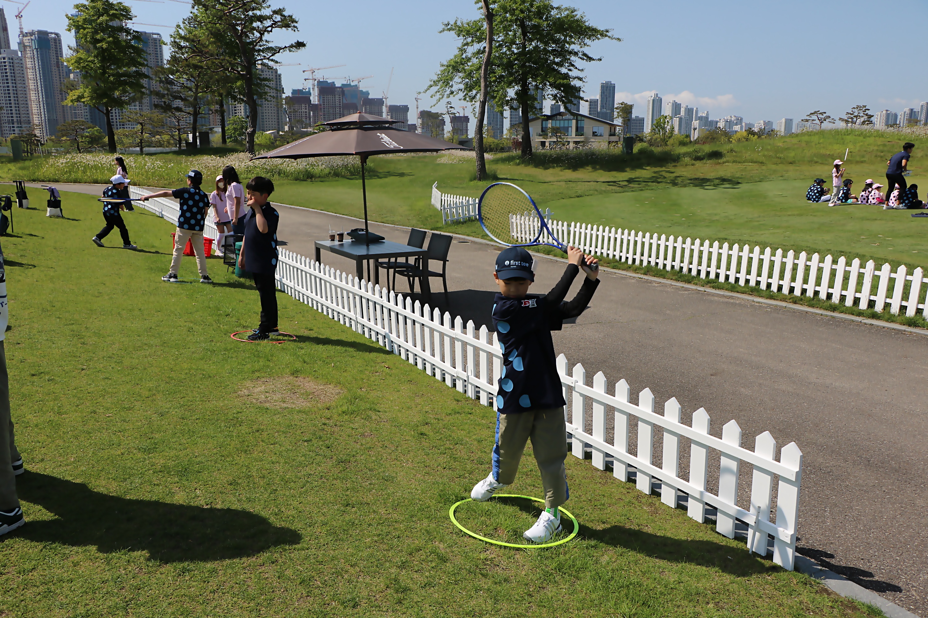 테니스 라켓을 이용해 대기 시간에 연습 스윙을 하고 있는 교육생 모습