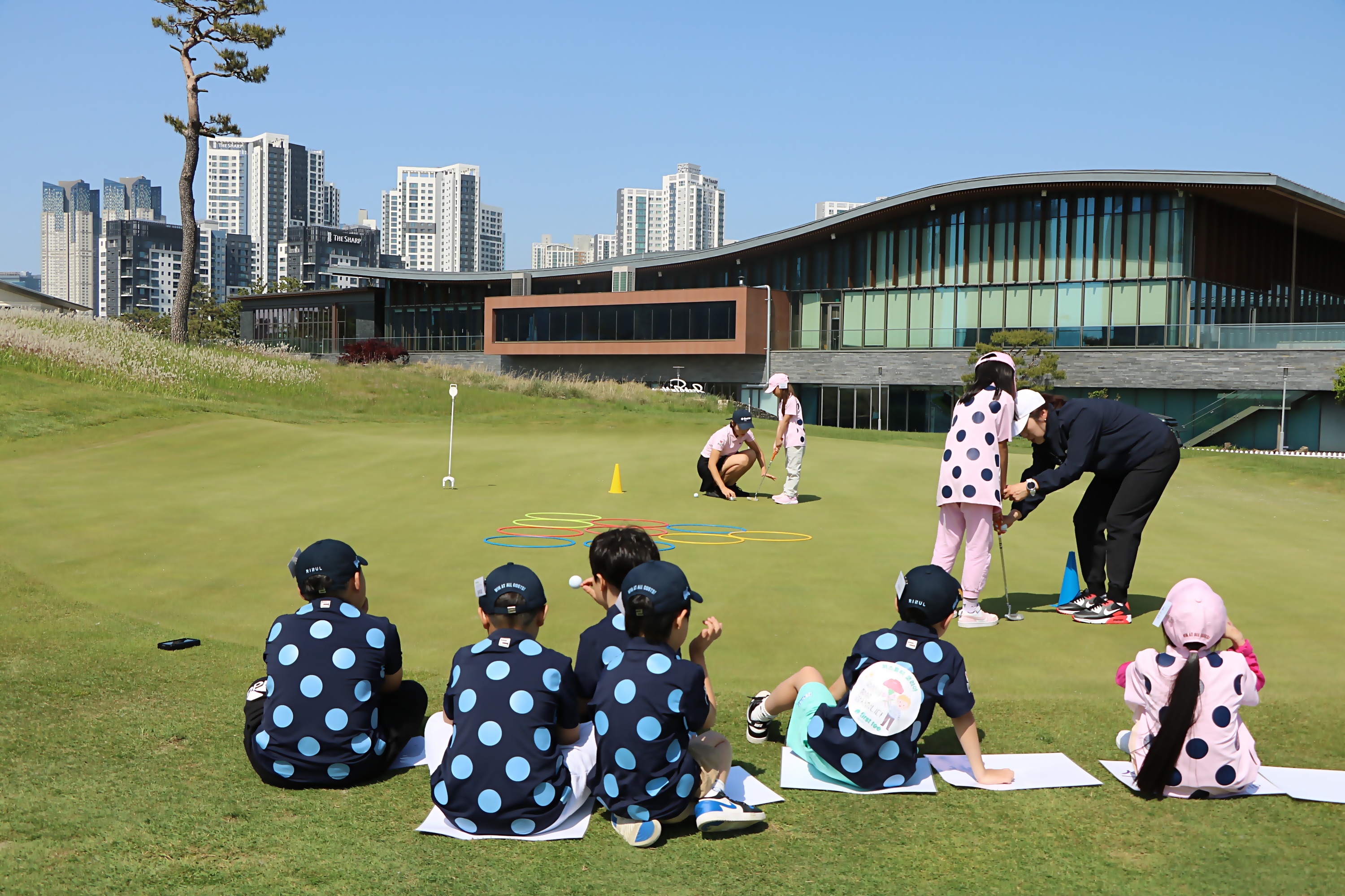 실제 그린 위에서 퍼팅하는 요령에 대해서 1:1로 레슨을 해주고 있는 모습