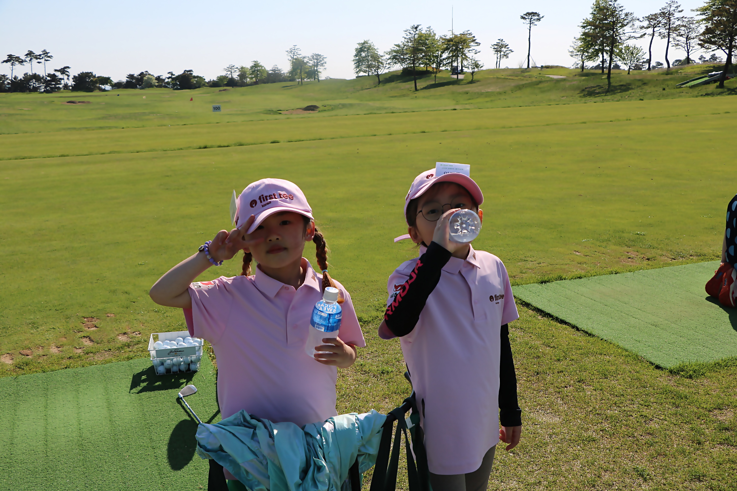 본격적인 골프실습에 앞서 포카리스웨트를 마시며 휴식을 취하고 있는 아이들