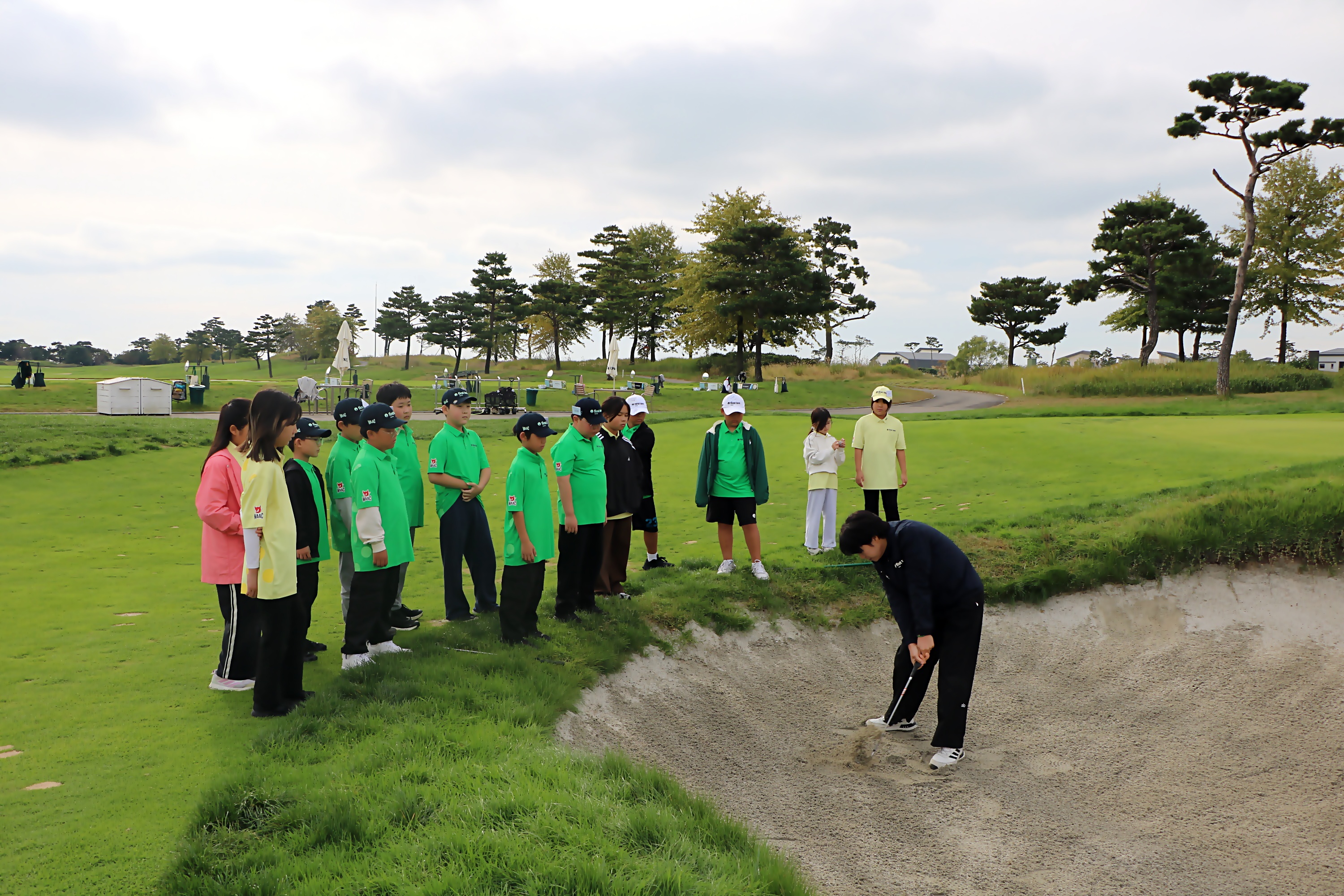 벙커샷시 유의할 점에 대해서 설명해 주고 있는 모습