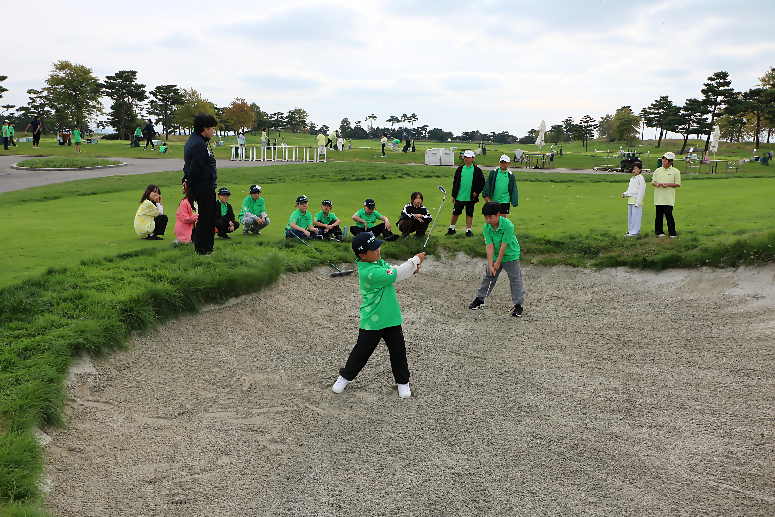 집중해서 벙커샷 실습을 하고 있는 모습