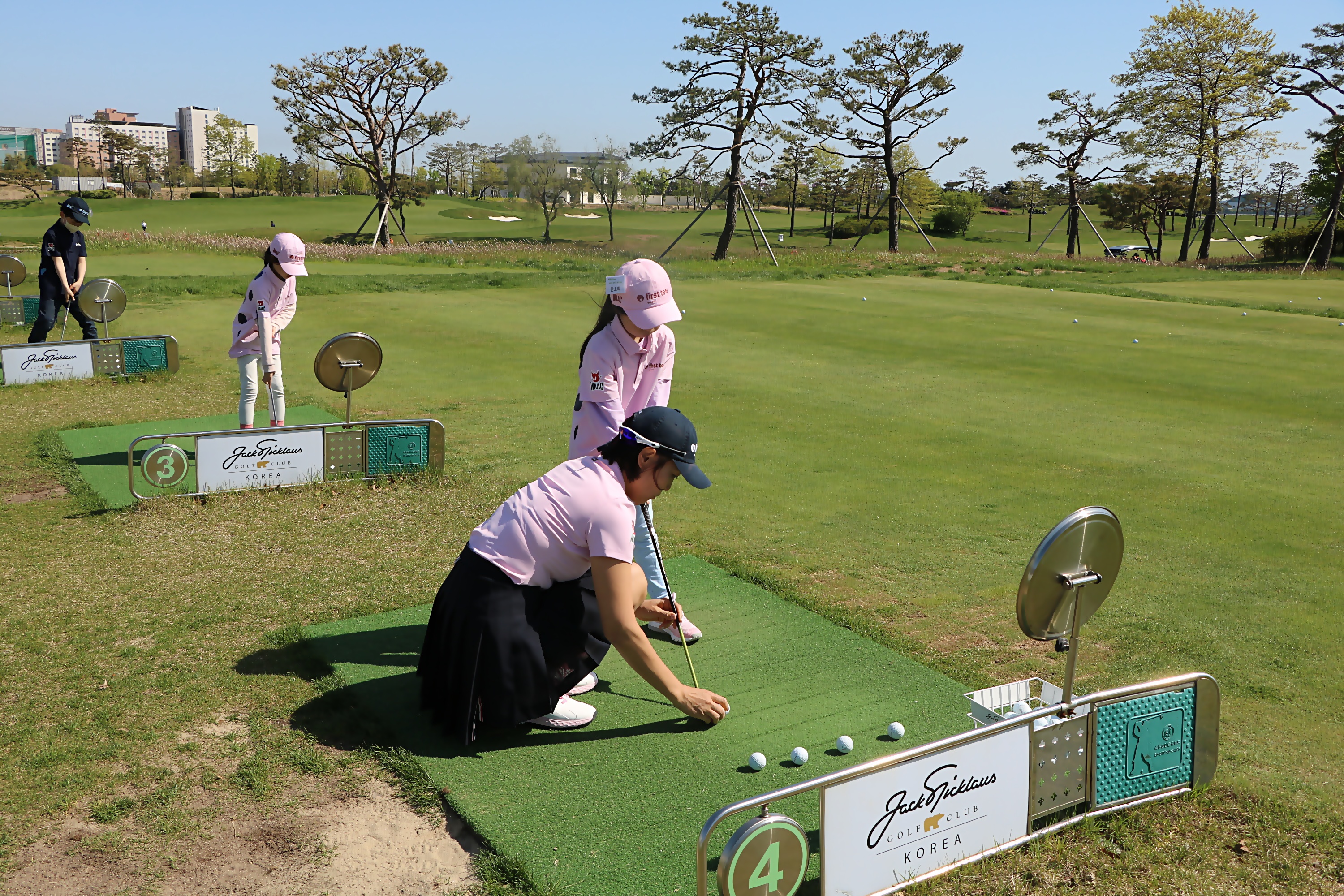 어드레스 시 볼위치와 클럽 페이스의 방향을 교정해 주고 있는 모습