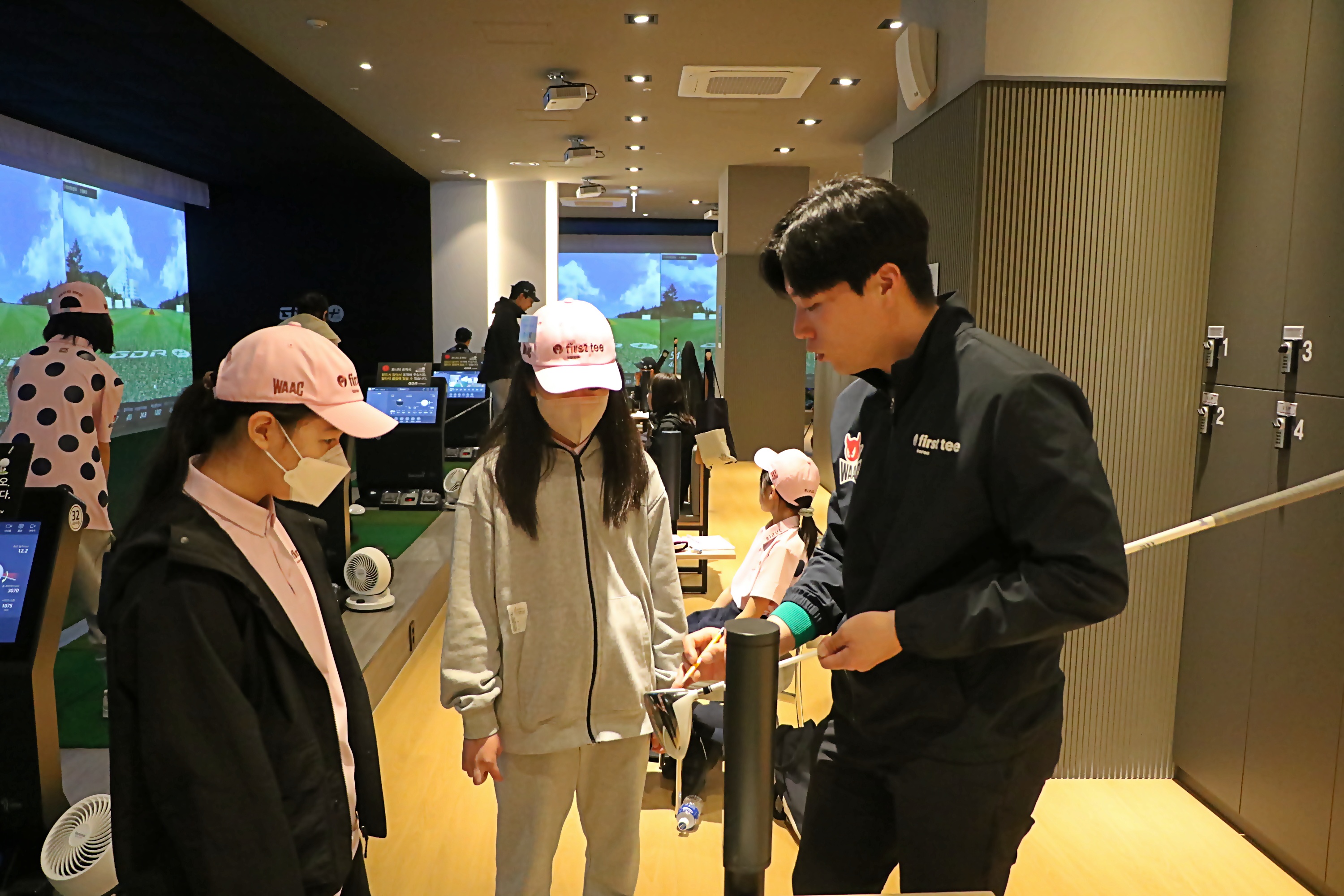 임팩트테이프를 클럽헤드에 부착하고 각자 스윙한 뒤 개인별로 현재 스윙의 문제점을 개선할 수 있도록 지도해 주고 있는 모습