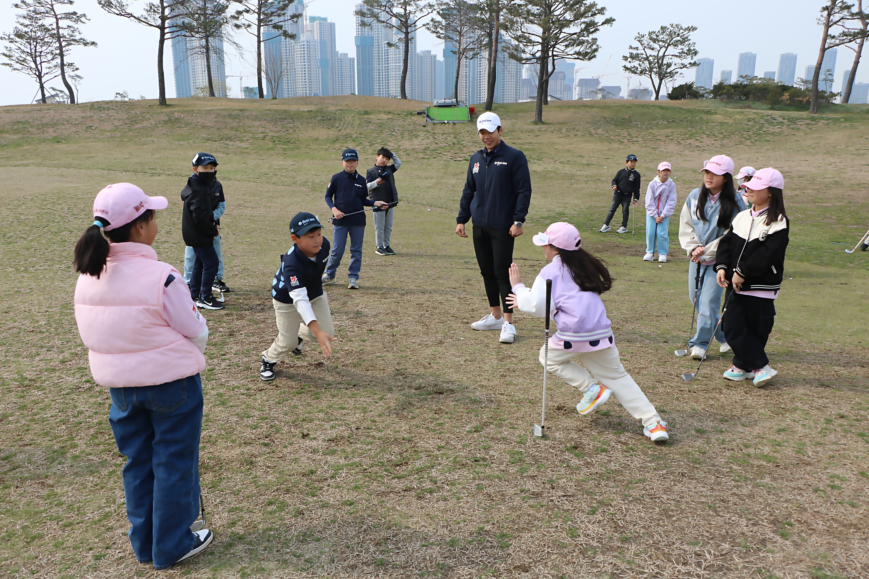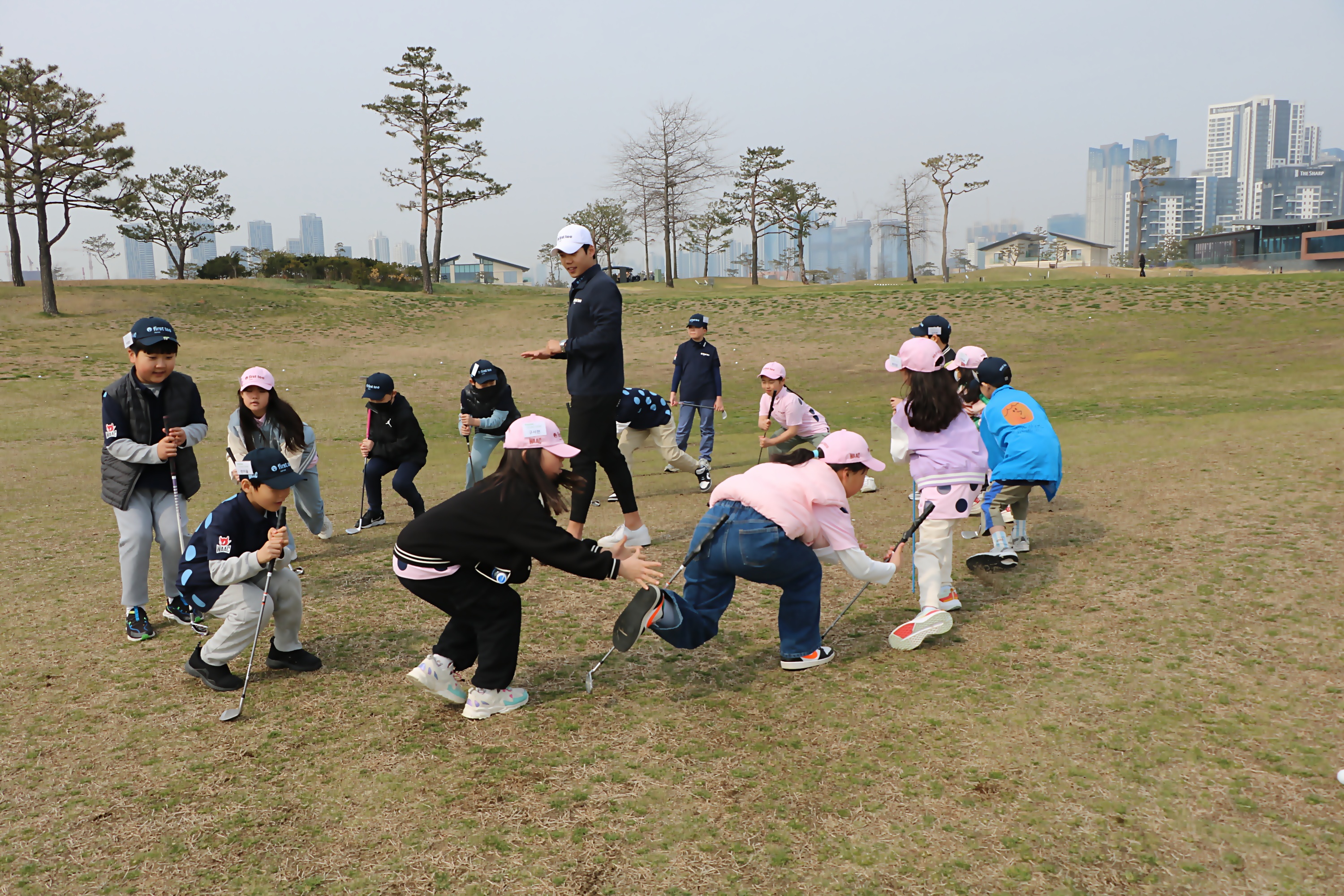 옆사람 골프클럽이 쓰러지기 전에 잡는 놀이를 하며 민첩성을 기르고 있는 아이들