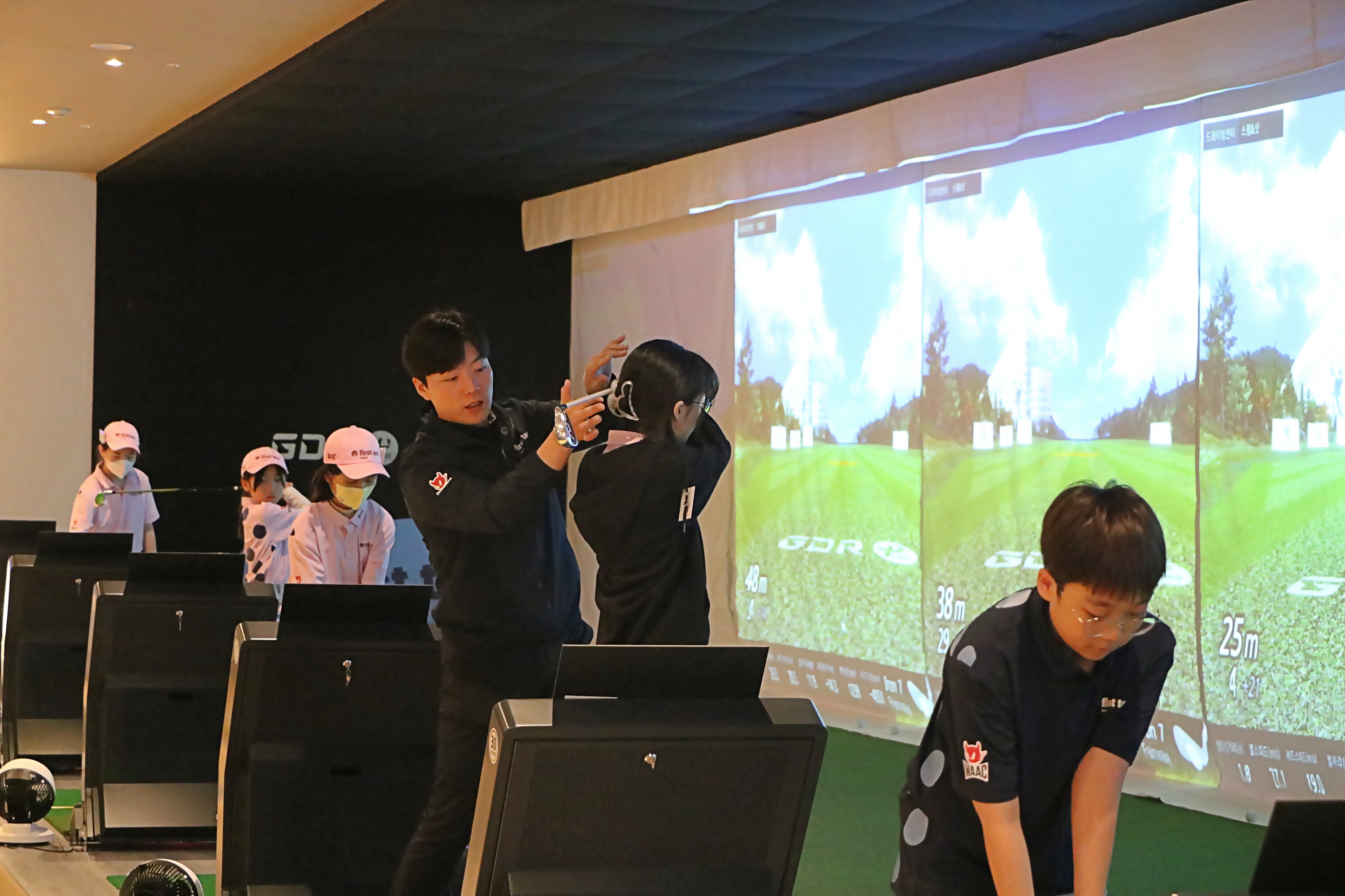 피니쉬 동작을 할 때 양손의 높이와 올바른 샤프트의 모양에 대해서 교정해주고 있는 모습