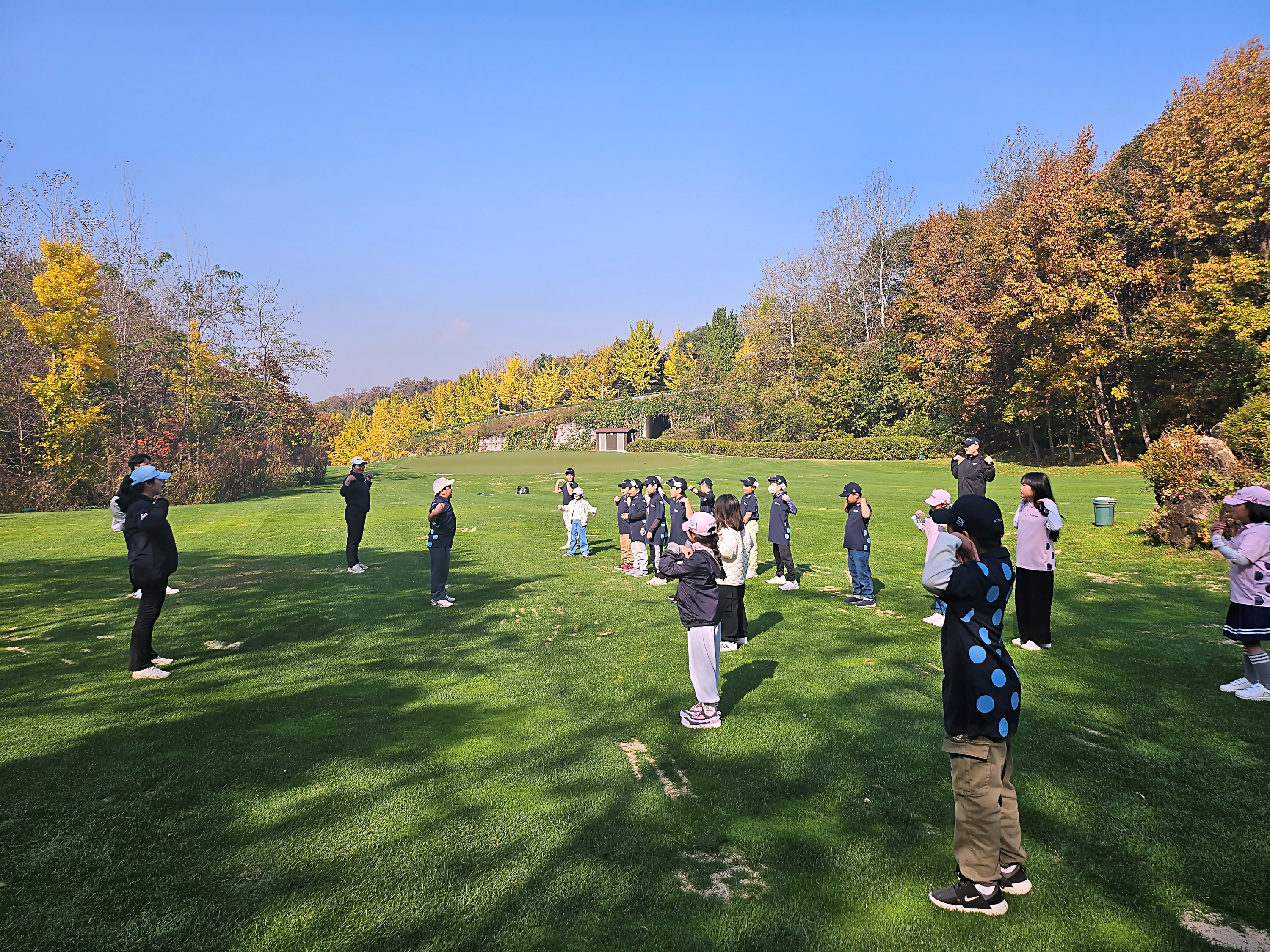 쌀쌀한 날씨로 인해 발생할 수 있는 부상방지를 위해 몸풀기를 하며 워밍업을 하고 있는 아이들