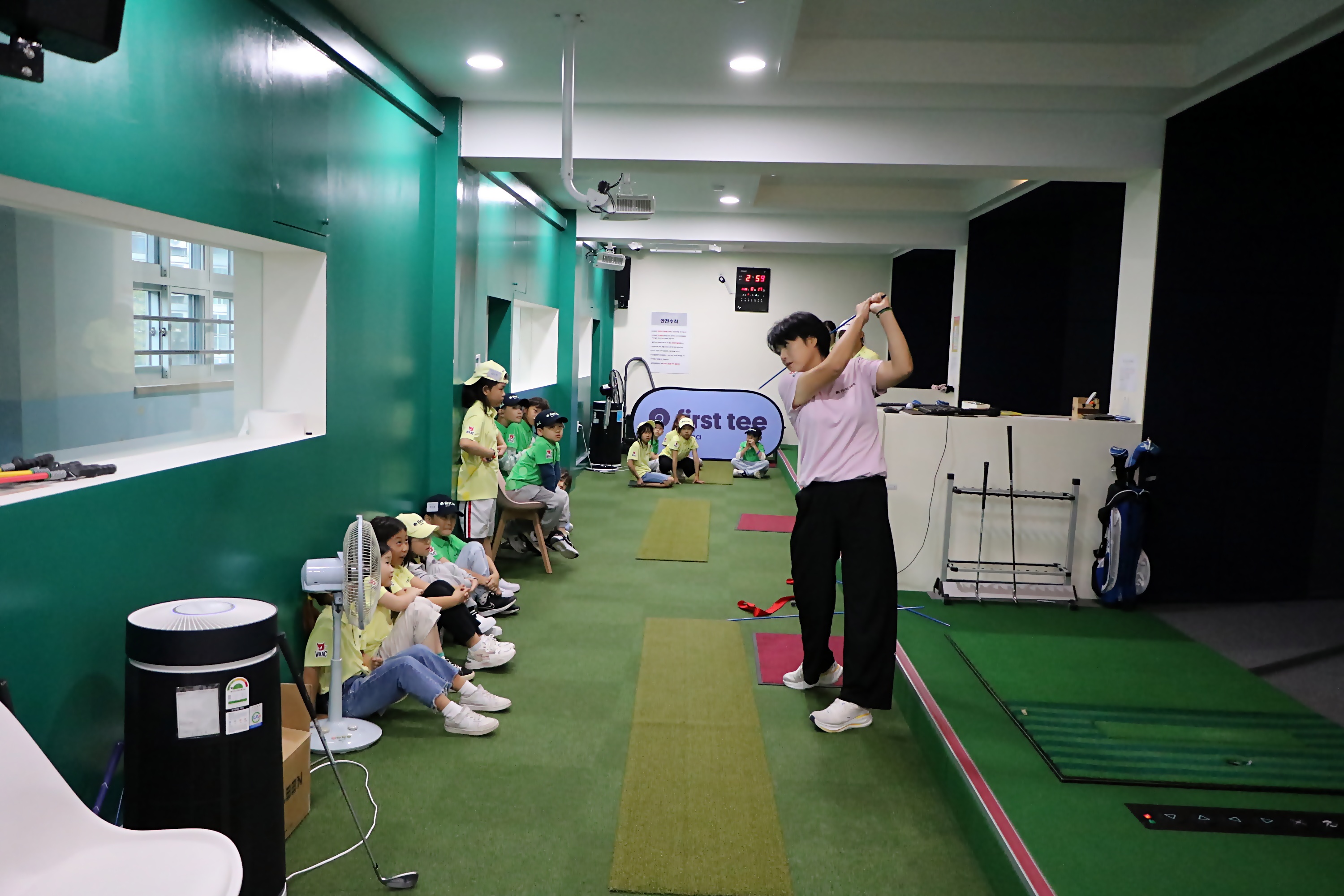 스윙스틱이 소리가 나게 휘두르는 연습 방법을 설명해 주고 있는 모습