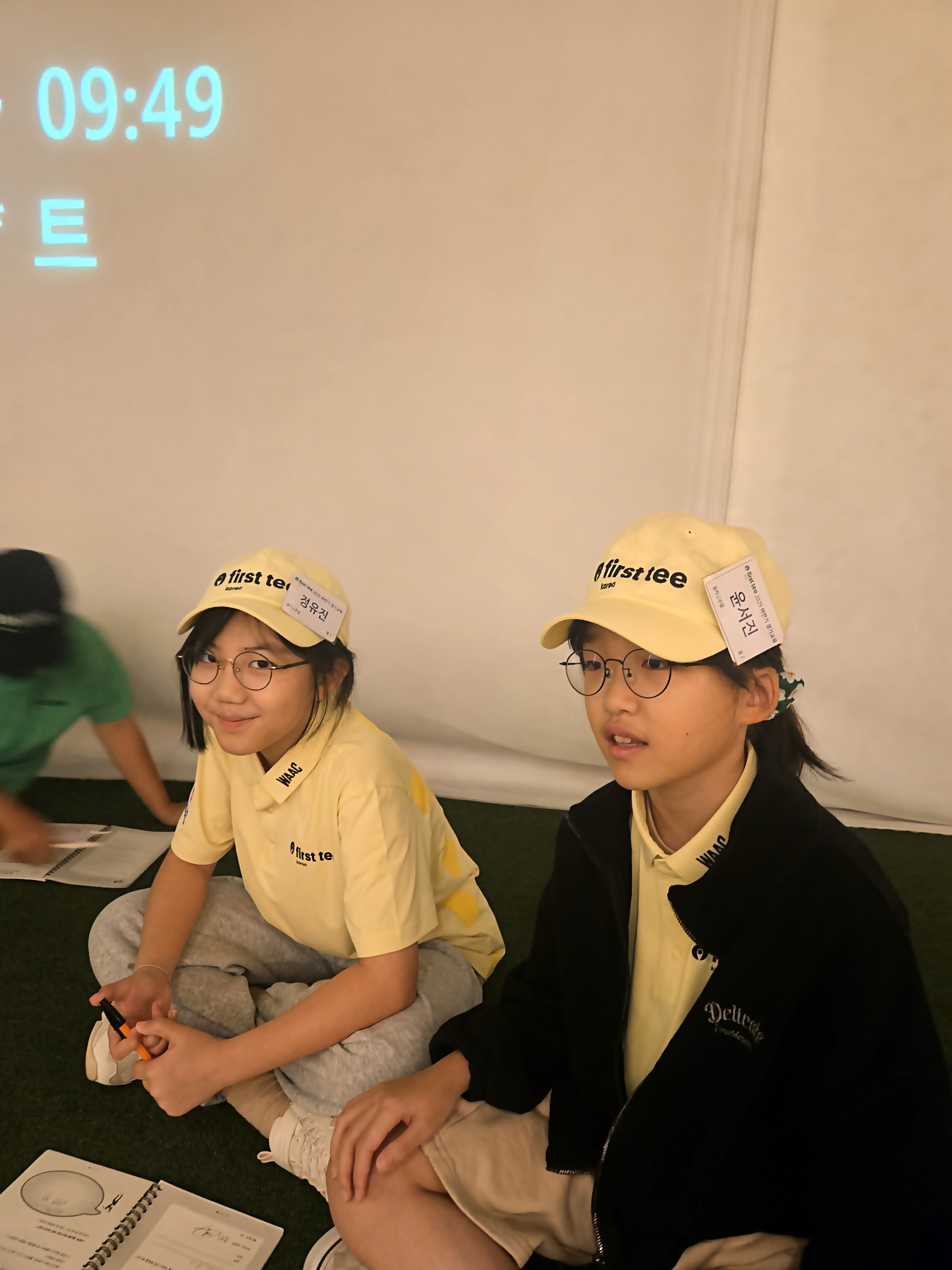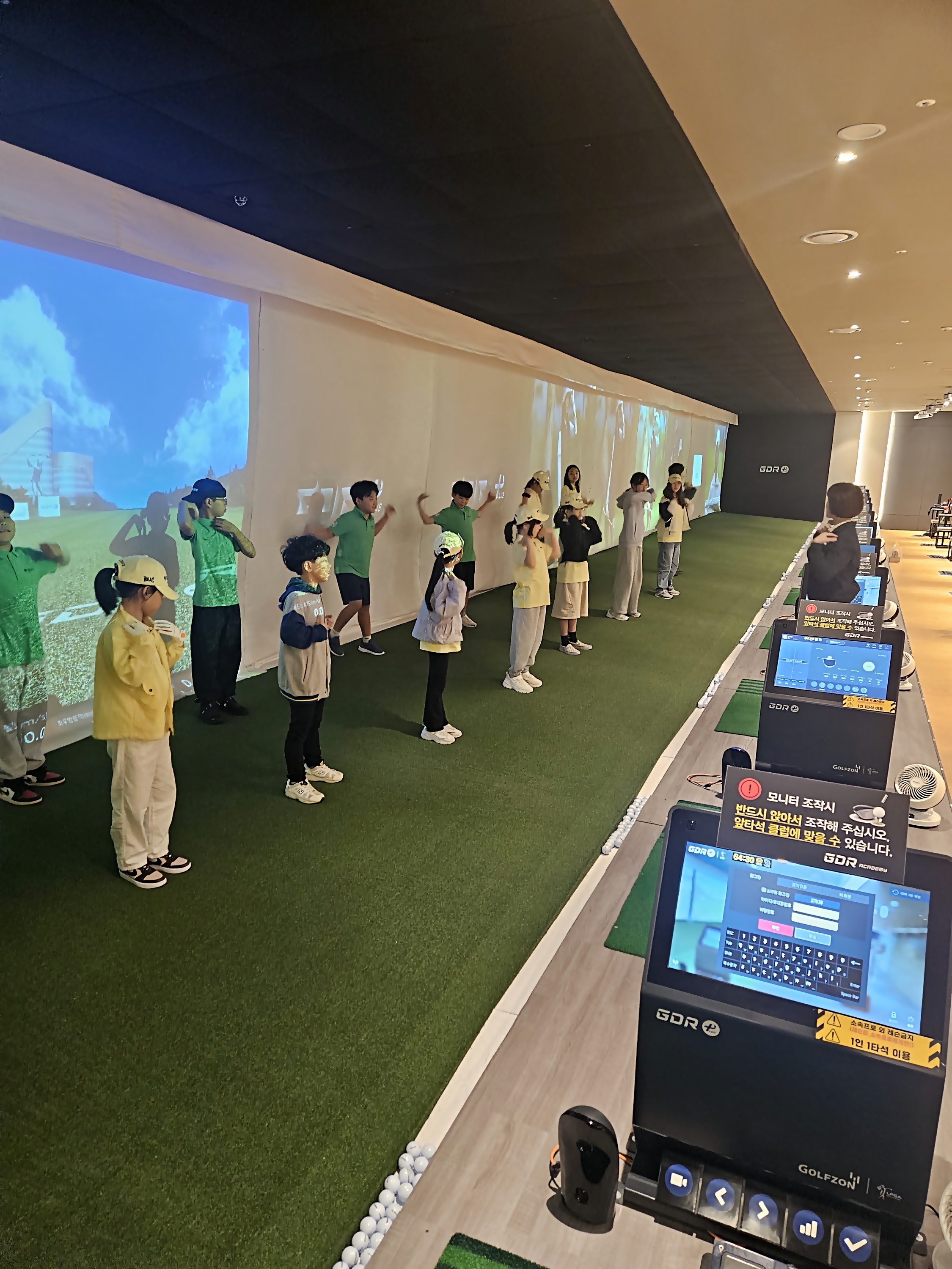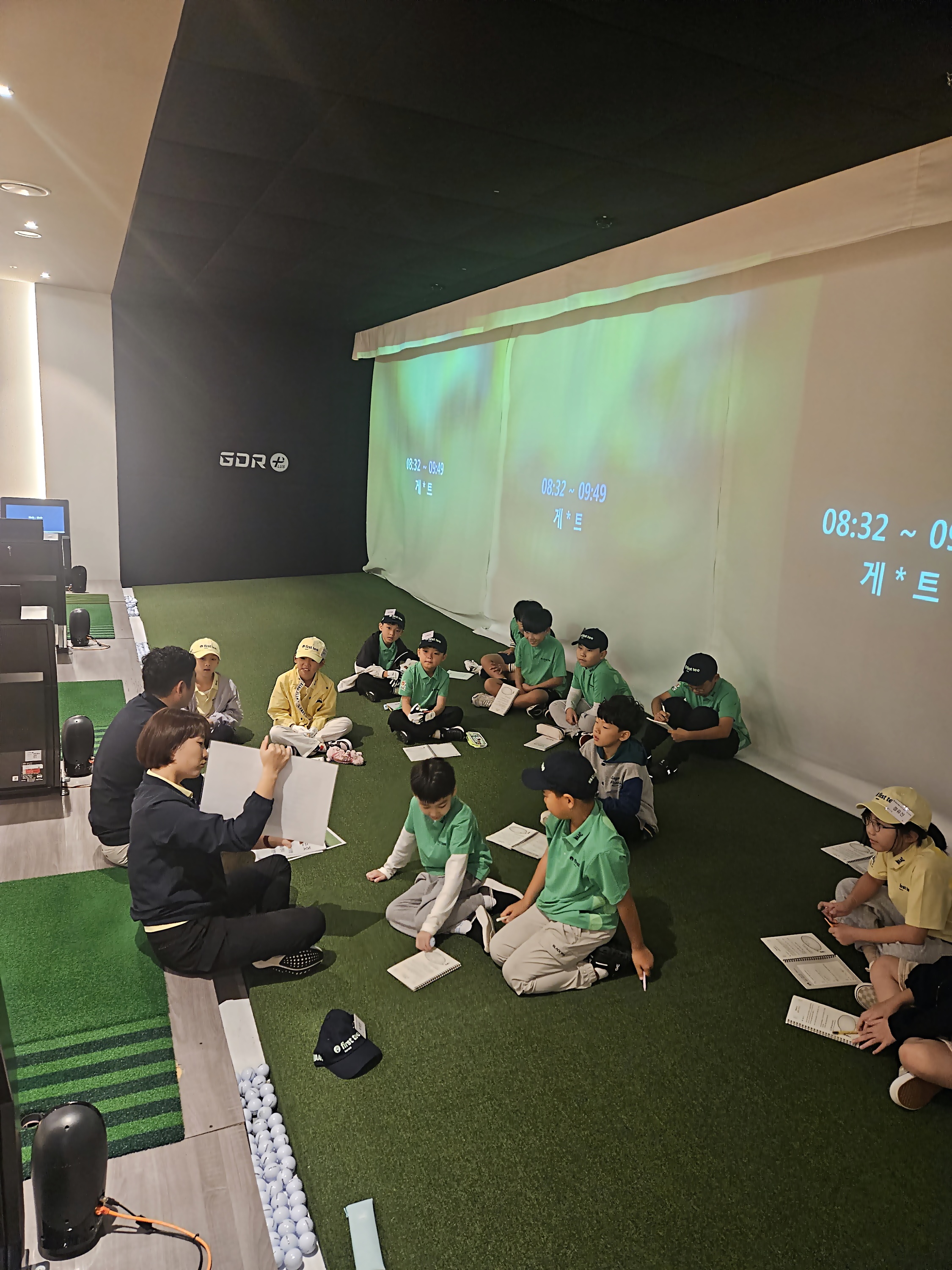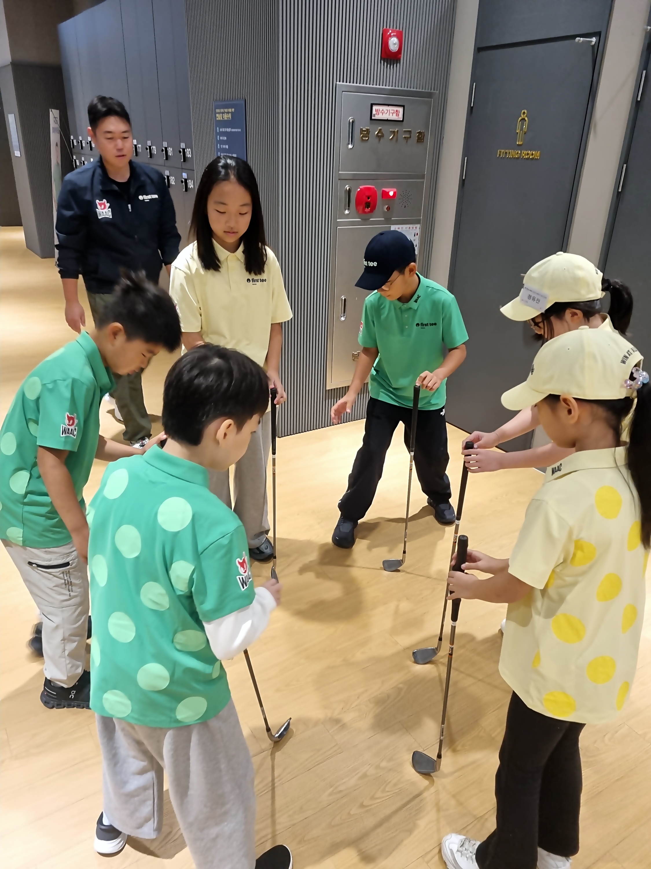 골프클럽잡기 등을 하며 가볍게 몸을 푼 뒤 7주차 수업에 집중하고 있는 아이들 모습