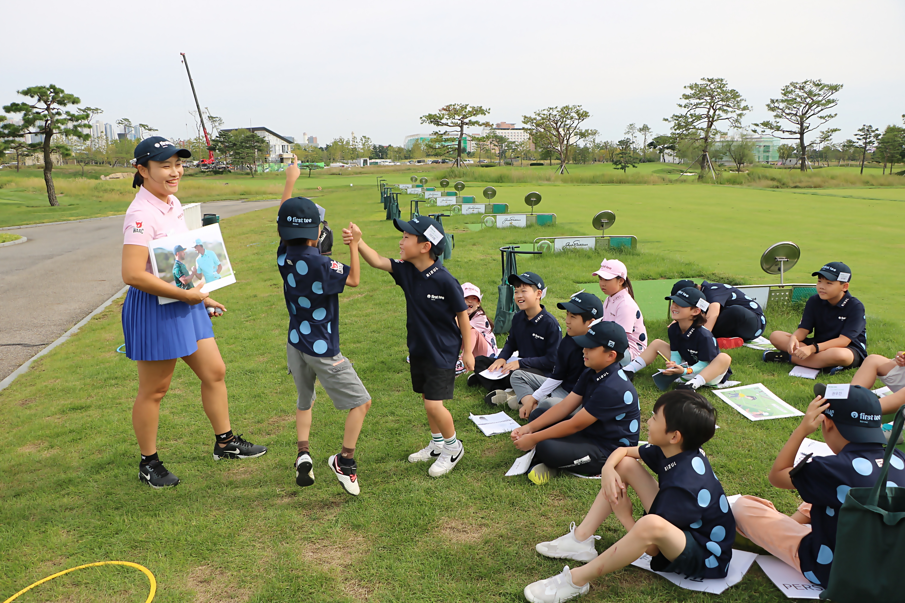 골프 플레이할 때 스포츠맨십을 실천하는 것을 직접 실습해 보고 있는 아이들