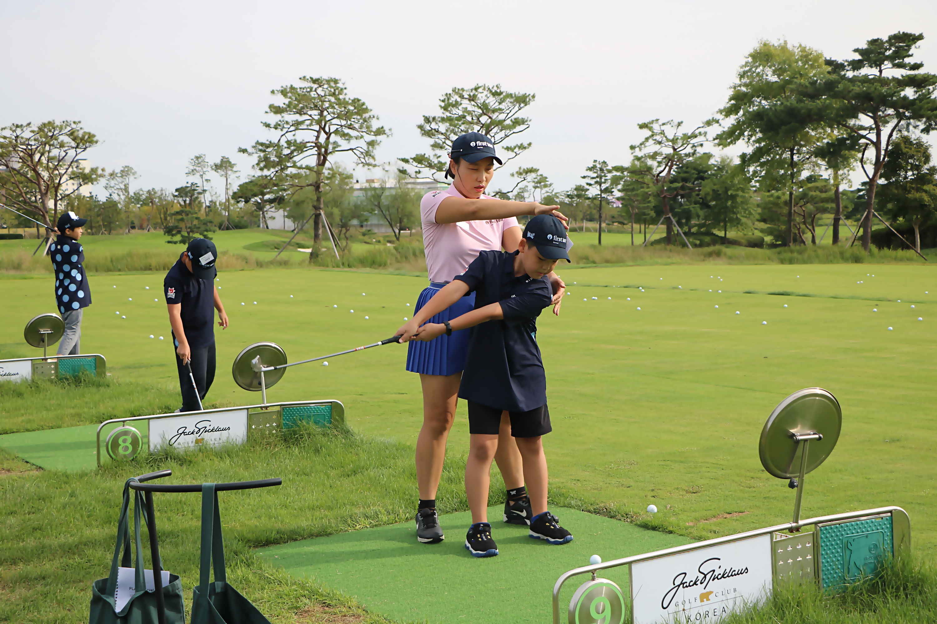 백스윙 자세를 지속적으로 교정해 주며 올바른 스윙동작을 만들어가고 있는 모습