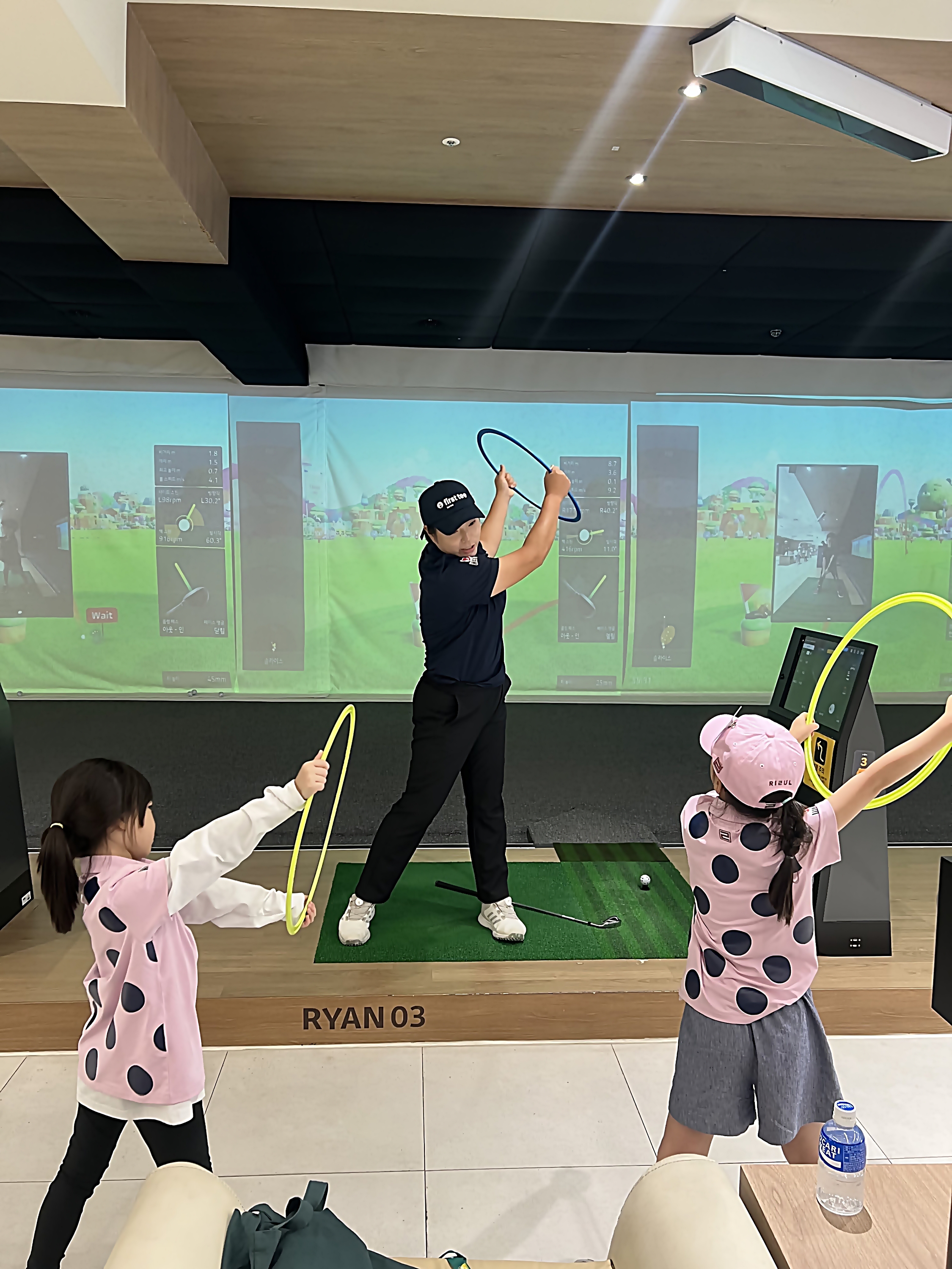 코치님을 따라 안전구역을 이용해 스윙원리를 익히고 있는 아이들