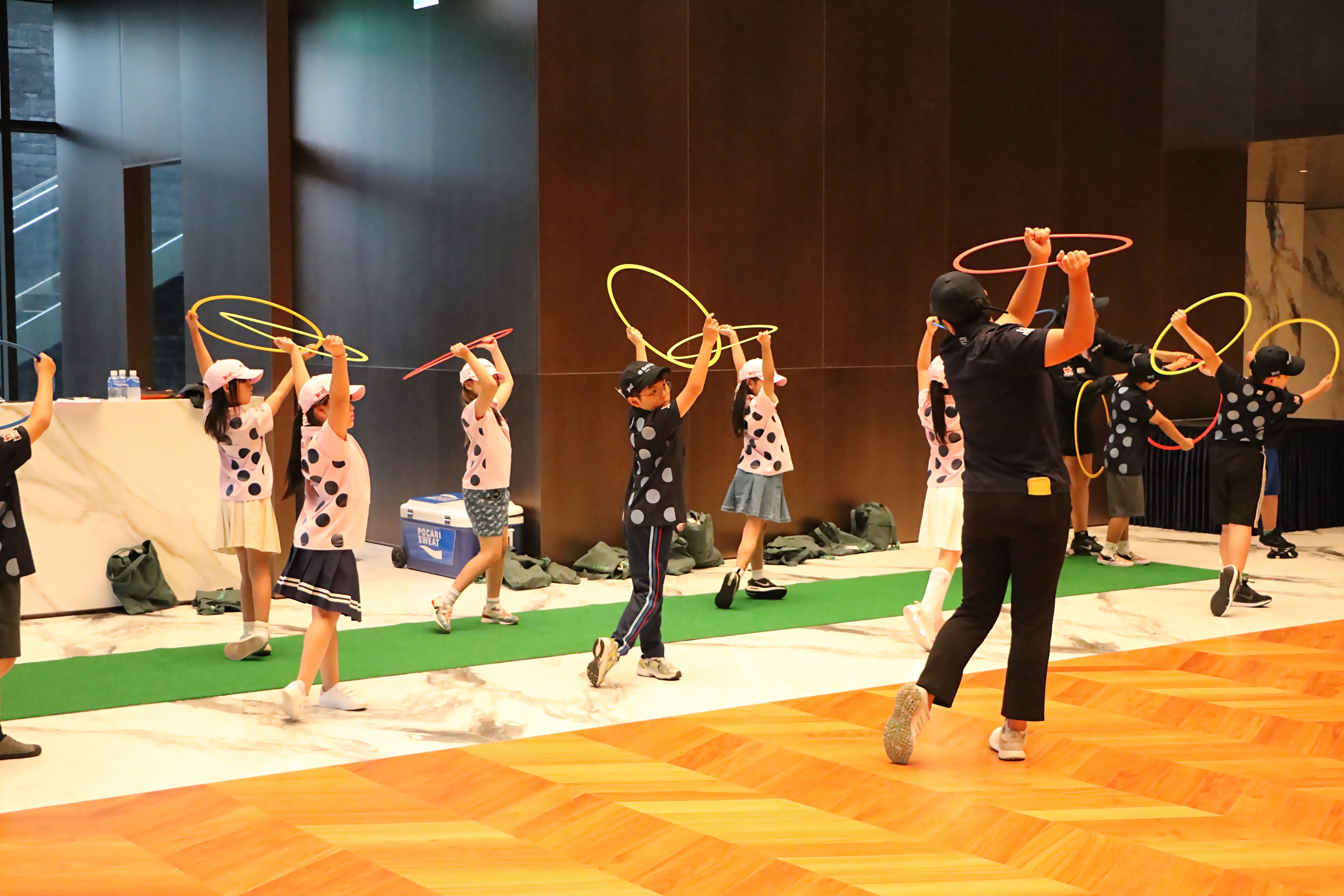 안전구역을 이용해 코치님을 따라 스윙동작을 하면서 몸을 풀고 있는 아이들