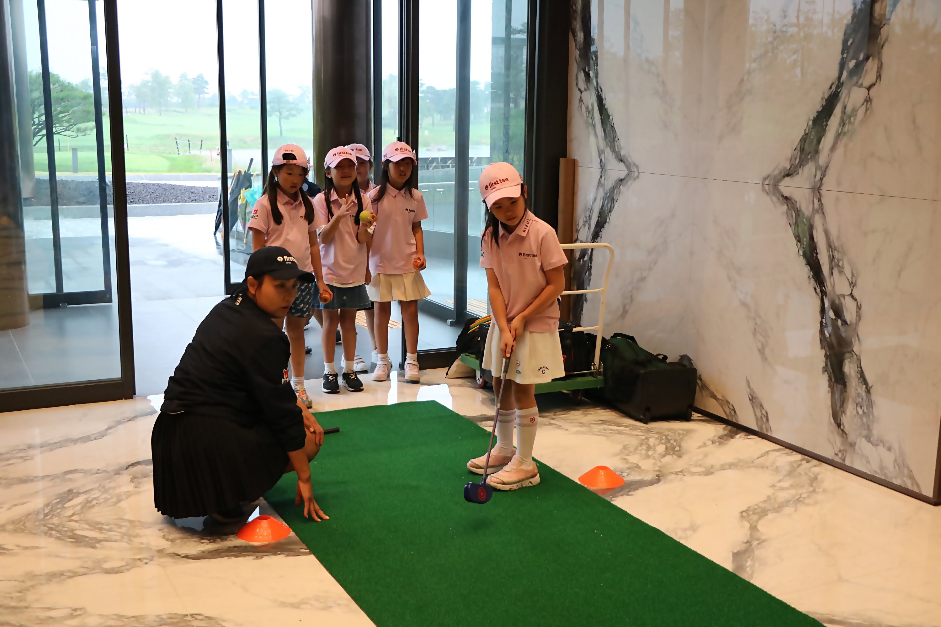 퍼팅게임을 통해 퍼팅에 대한 기본 개념을 익히고 있는 아이들