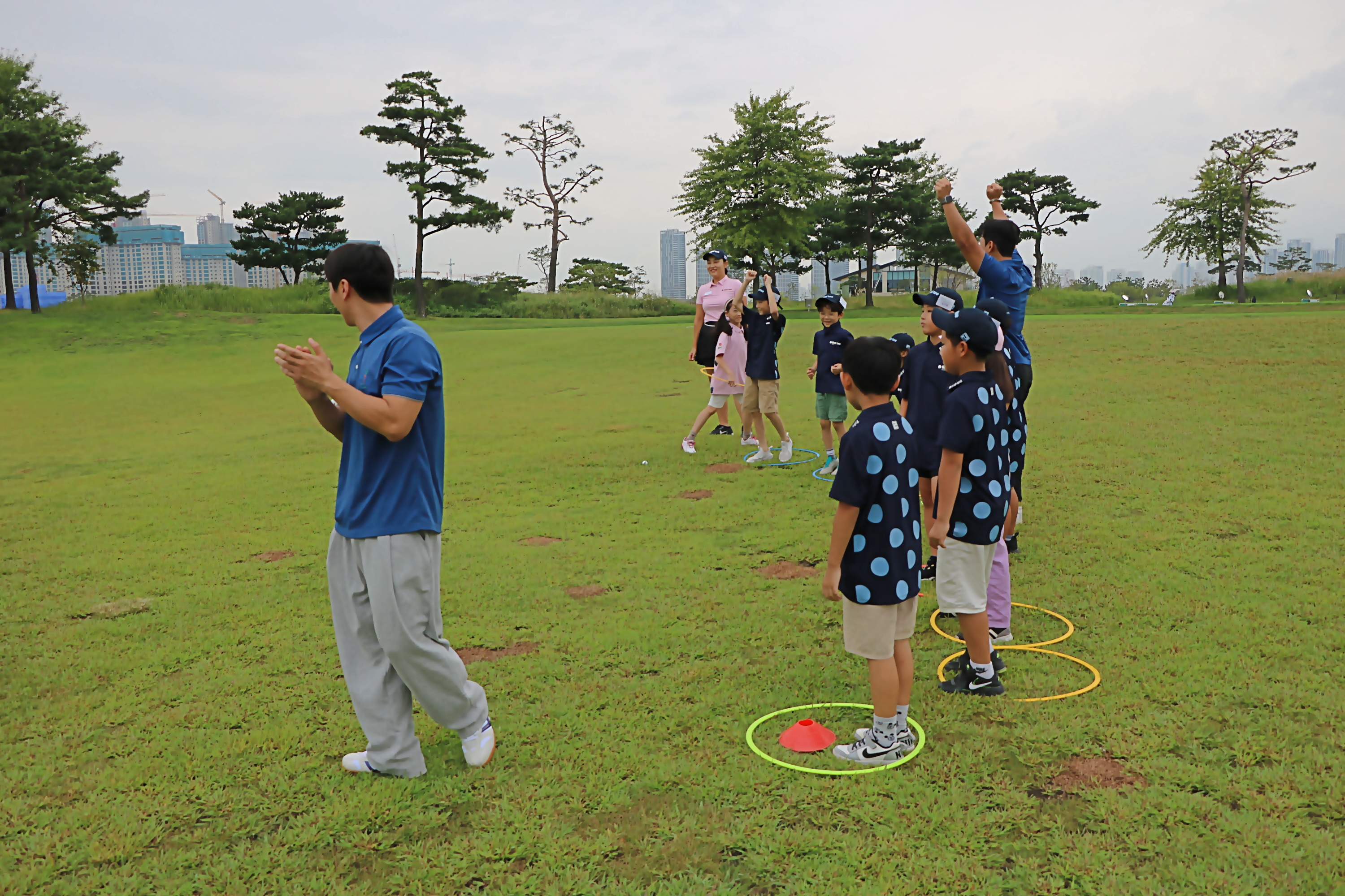 팀대항전에서 승리가 확정되자 기뻐하는 코치와 아이들