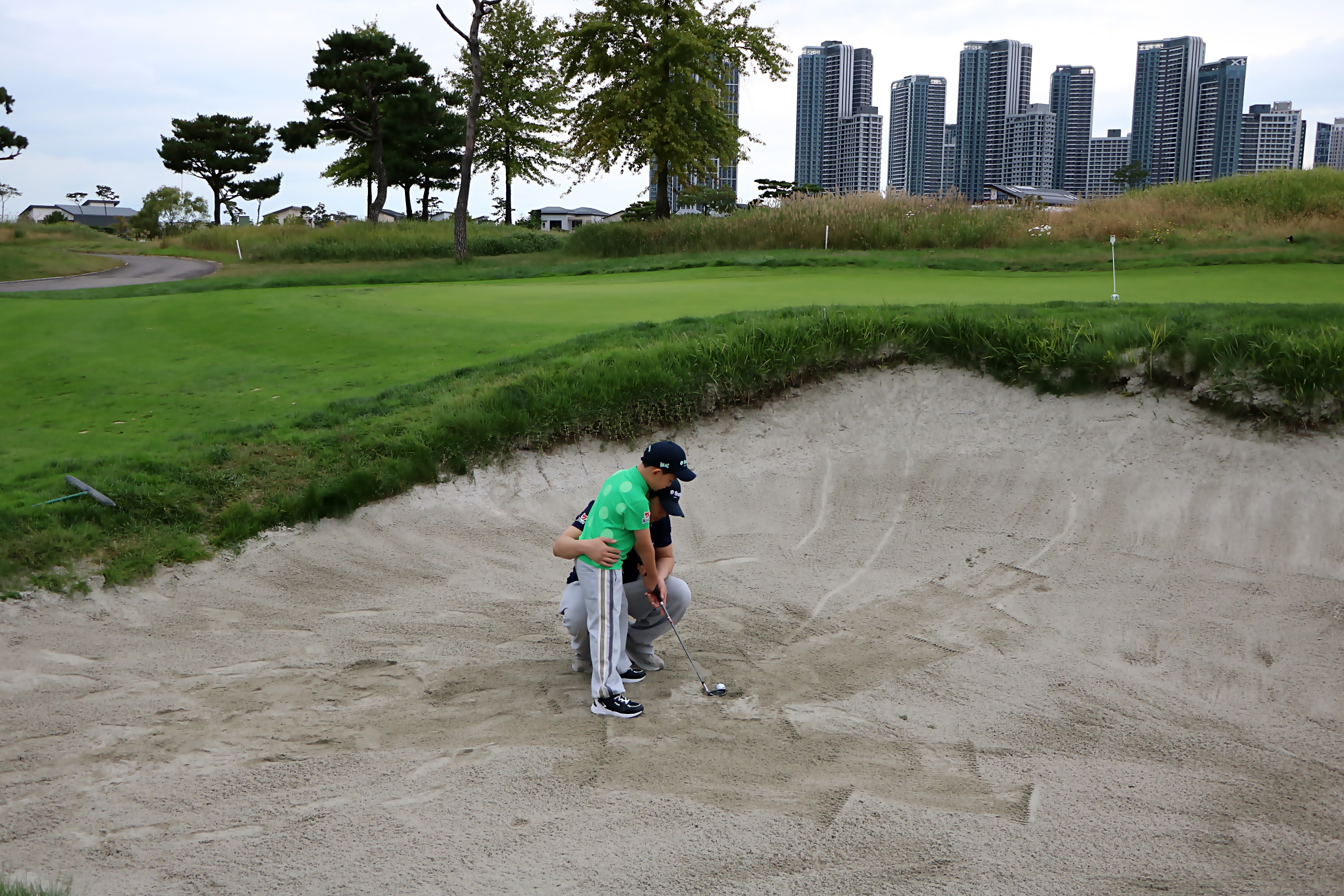 벙커에서 쉽게 탈출하려면 절대로 먼저 볼을 직접 맞춰서는 안된다고 설명해 주는 모습