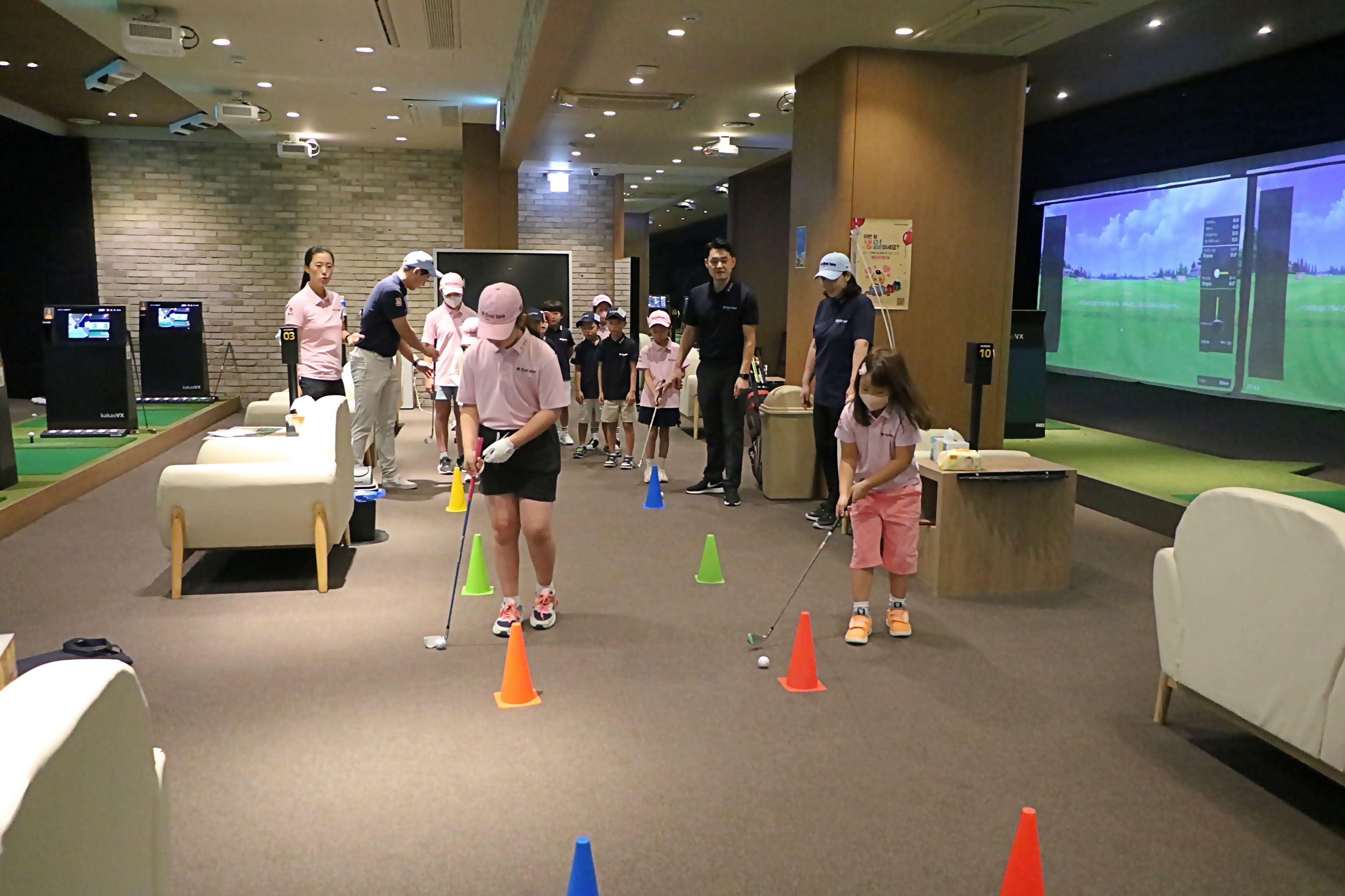 골프클럽과 보다 빨리 친숙해질 수 있도록 게임을 통해 아이들에게 골프를 지도하고 있는 모습