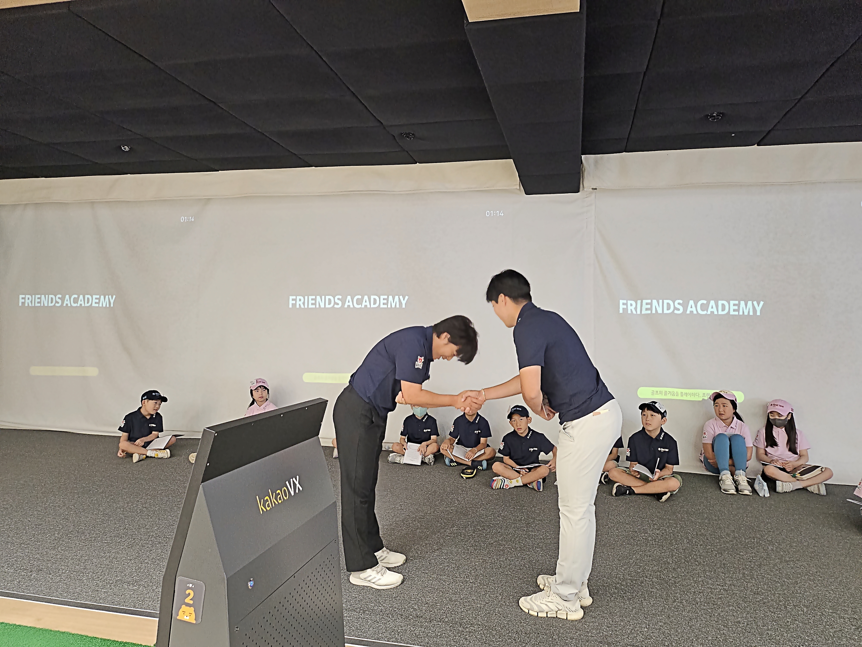 골프라운드를 하기 전에 서로 인사하기 시범을 보여주고 있는 모습
