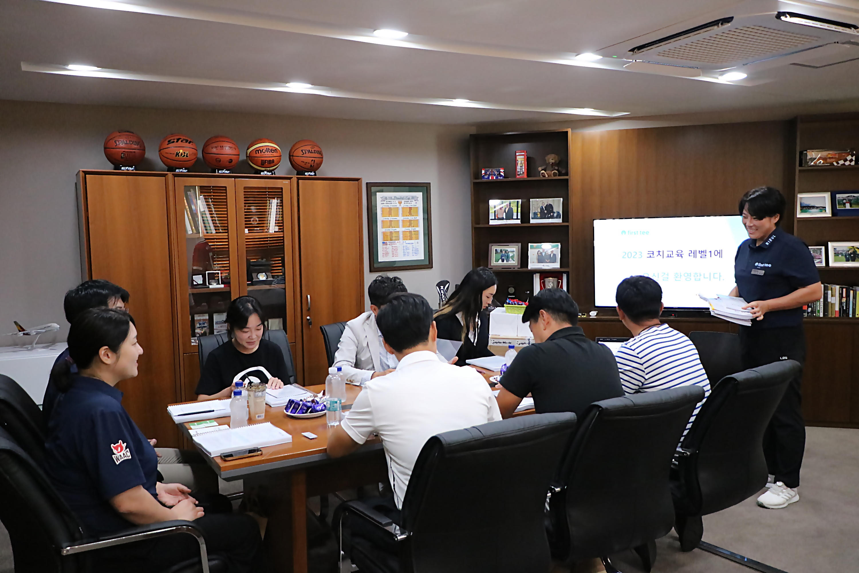 환영인사를 하며 퍼스트 티 교육프로그램에 대한 소개를 하고 있는 리드코치