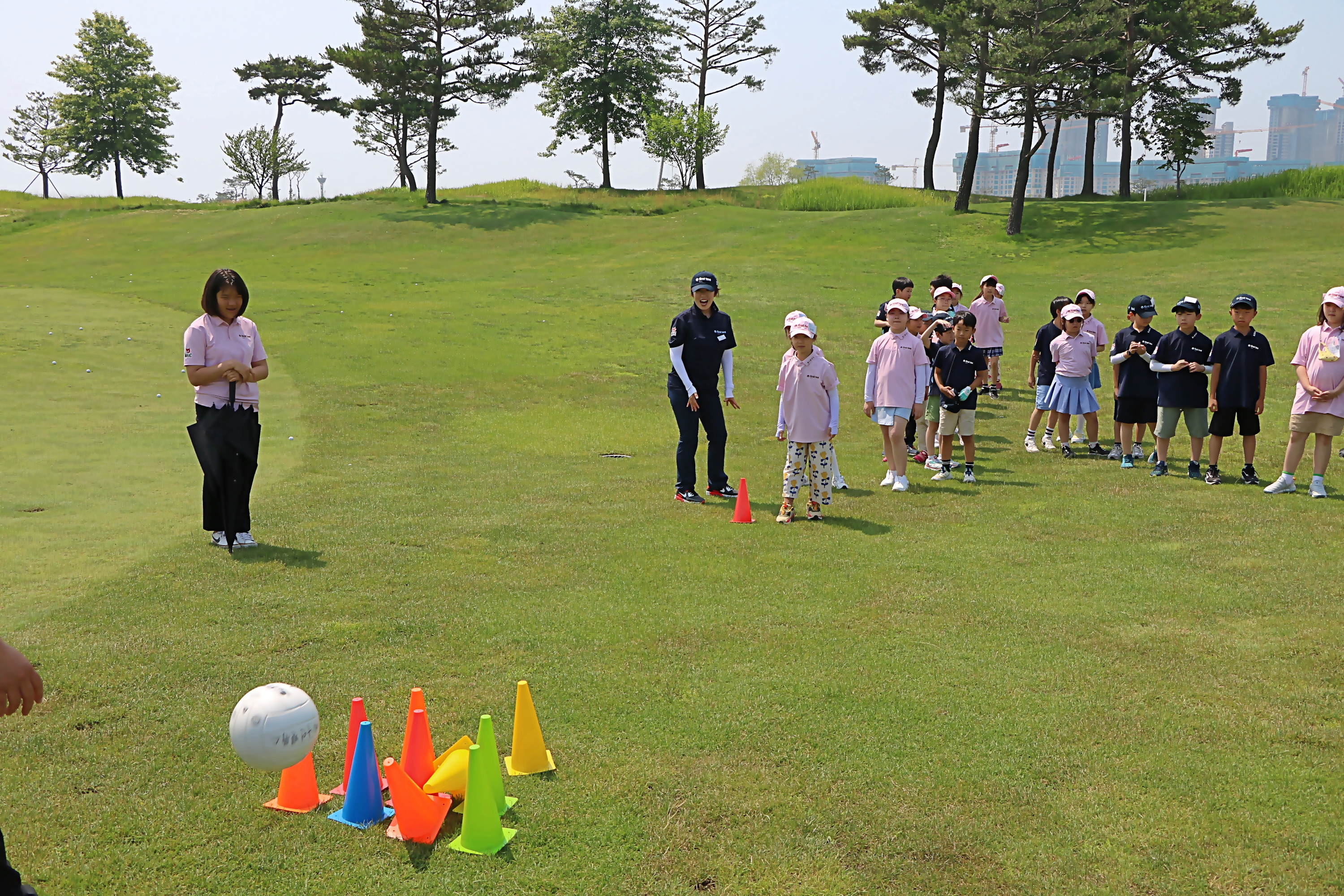 배구공을 굴려 전방의 고깔콘을 많이 넘어뜨리는 게임을 하면서 즐거워하는 아이들