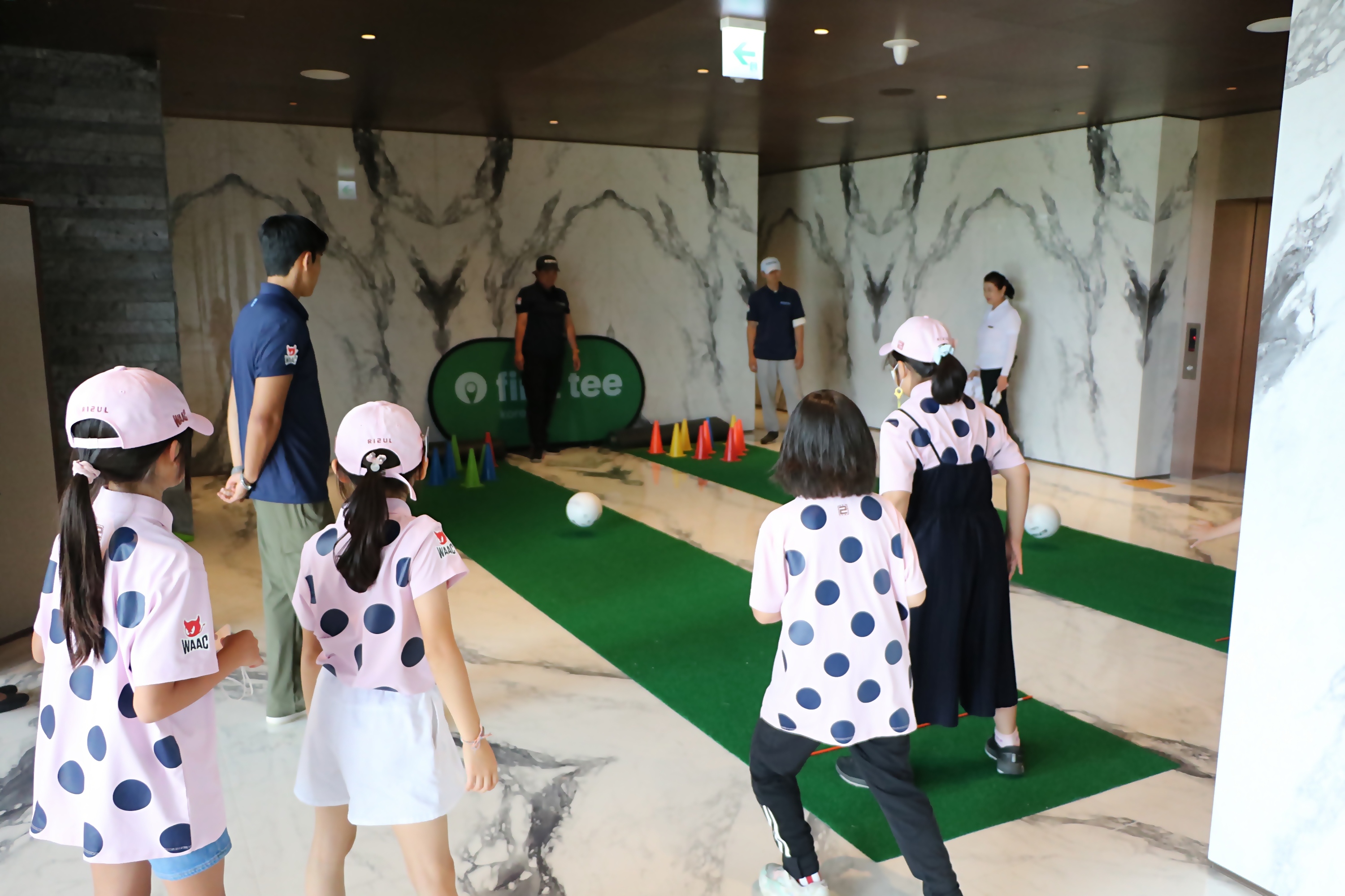볼을 멀리 보내기 위해서는 백스윙과 팔로우스루의 크기가 같아야 한다는 원리를 가르쳐 주기 위해 배구공을 굴려 전방의 고깔을 최대한 많이 쓰러뜨리기 게임을 하고 있는 모습