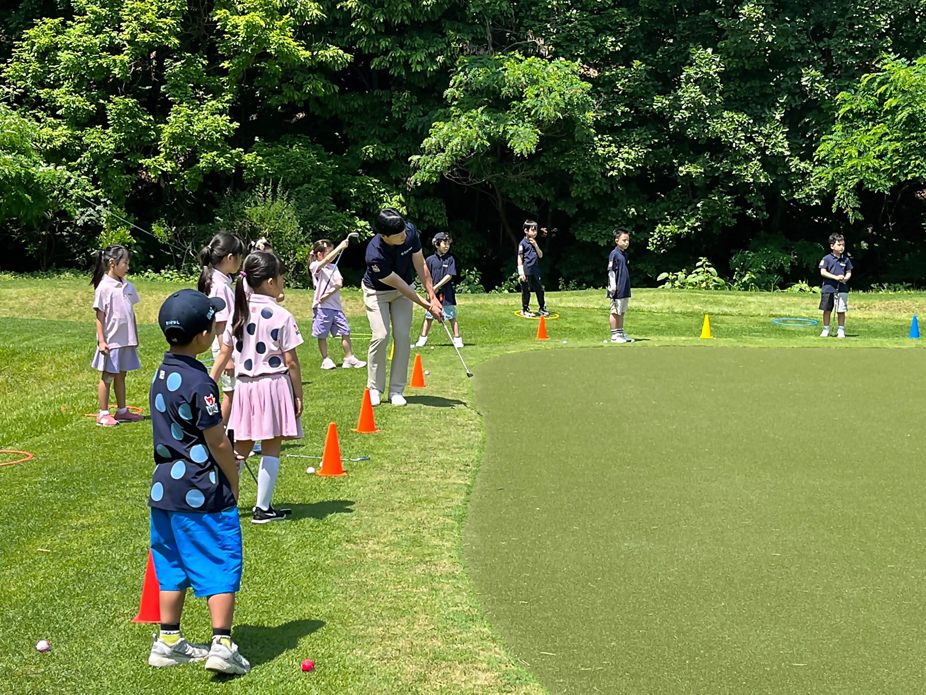 그린 주변에서 홀깃발에 볼을 가까이 붙이는 어프로치샷하는 요령에 대해 직접 시범을 통해 가르쳐 주고 있는 모습