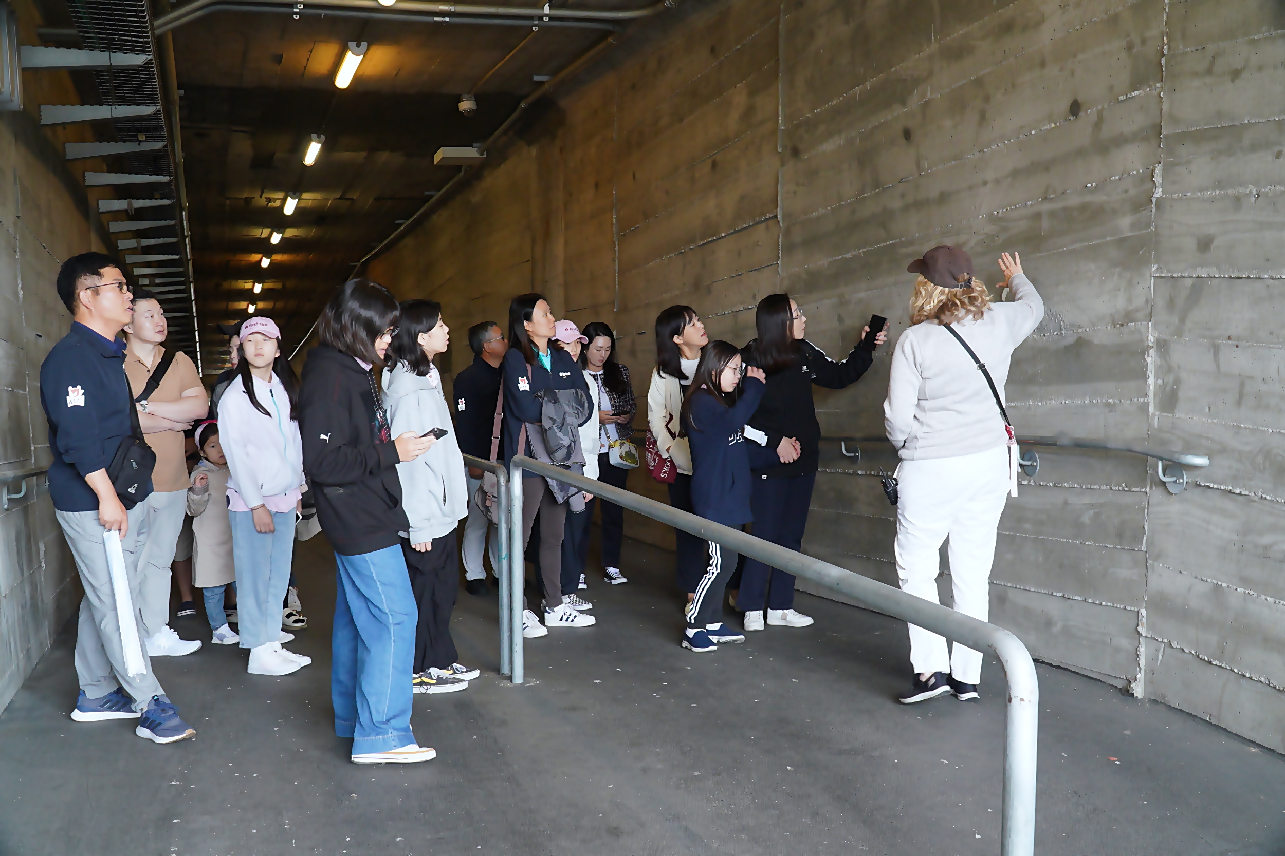 선수들이 메인 경기장으로 이동하는 통로의 벽면의 모양이 이렇게 생긴 이유에 대해 설명을 듣고 있는 방문단