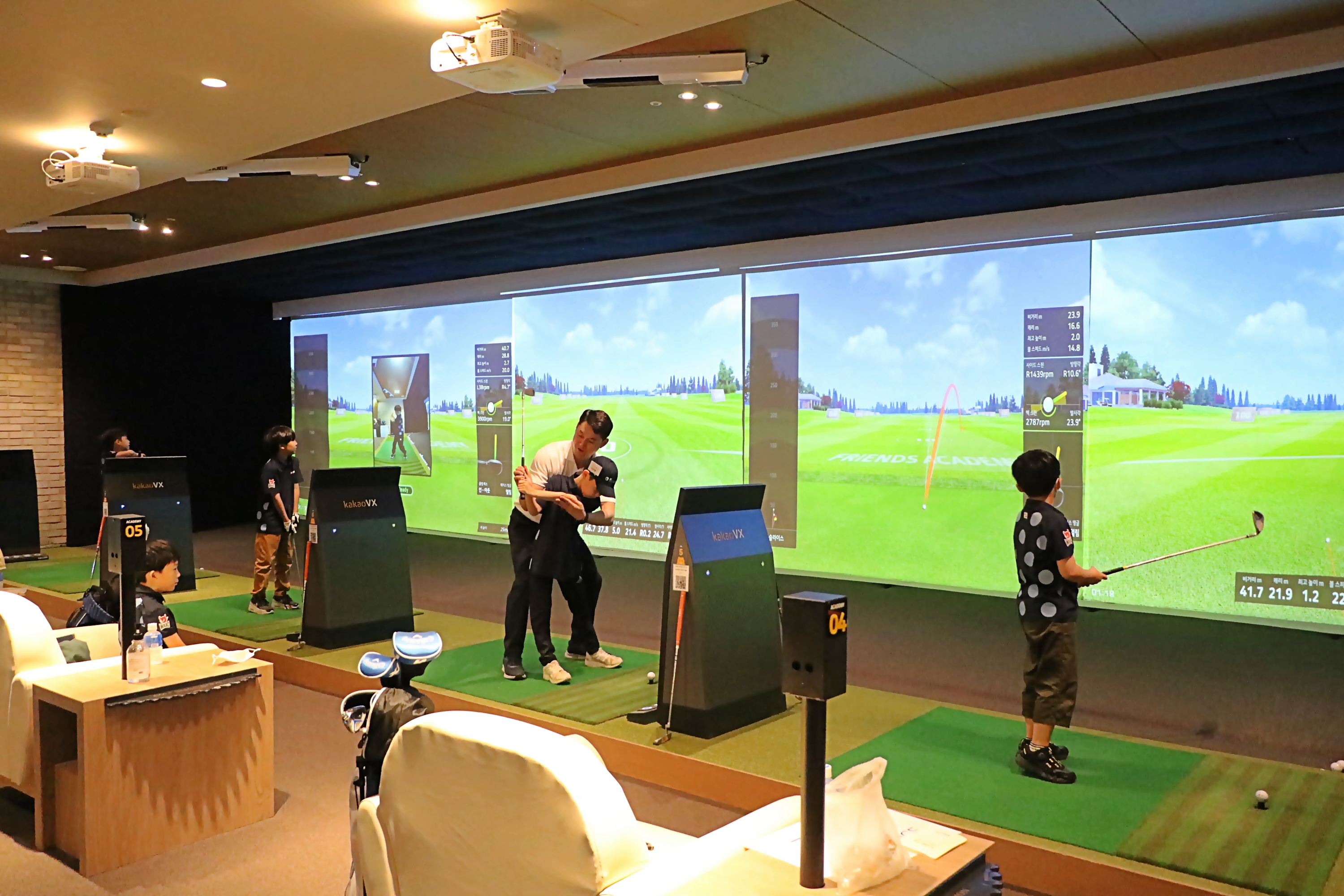 자율적으로 스윙 실습을 하고 있는 가운데 개별적으로 레슨을 해주고 있는 모습