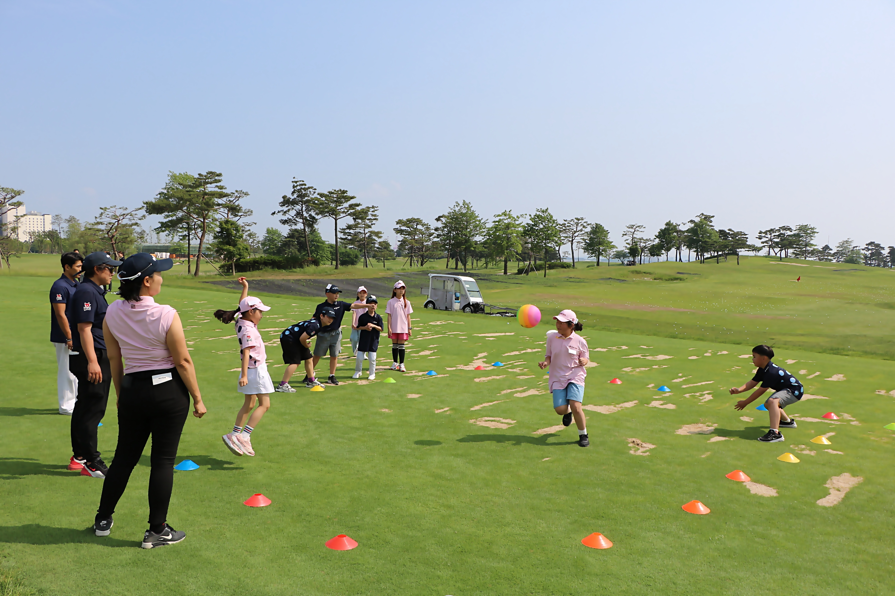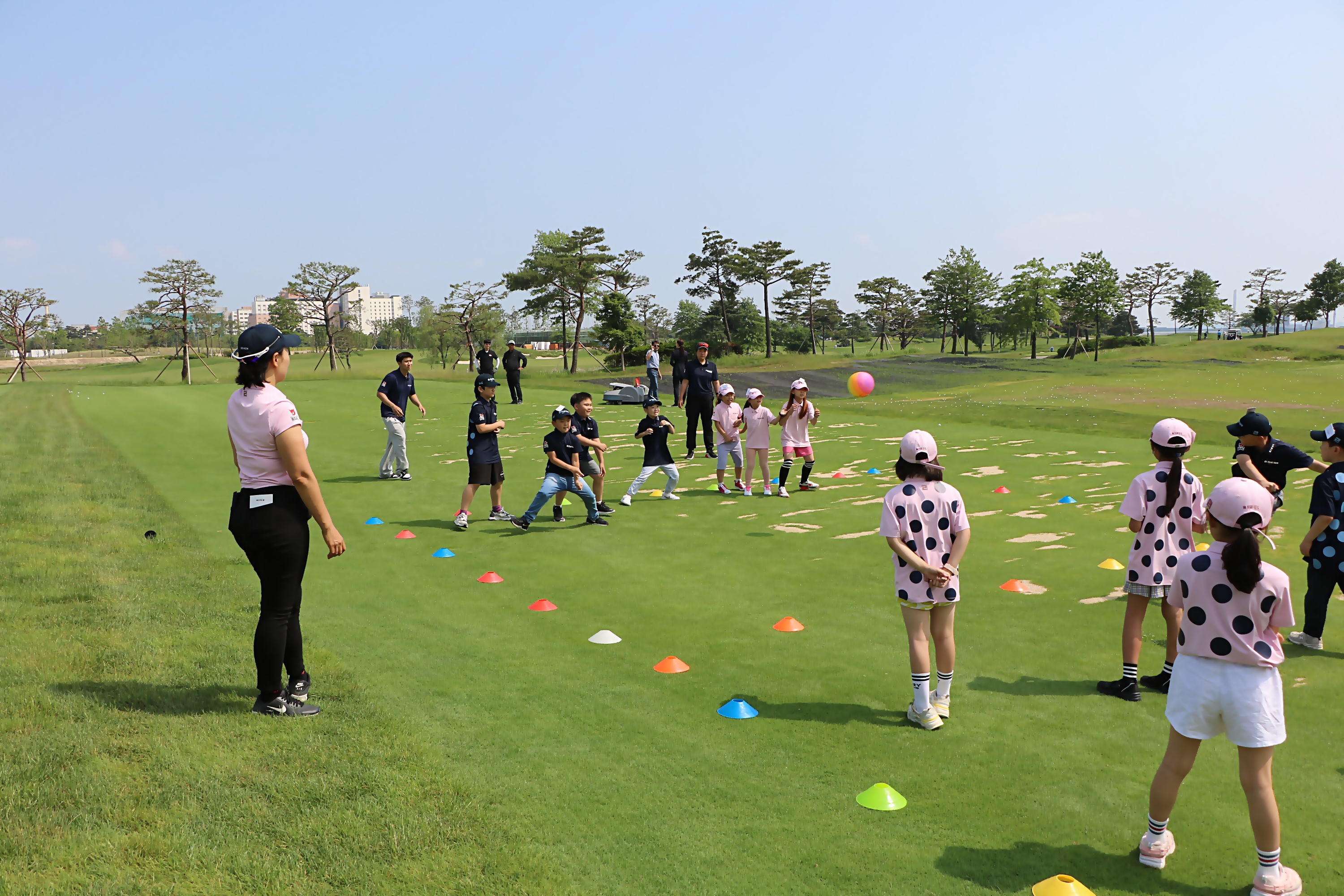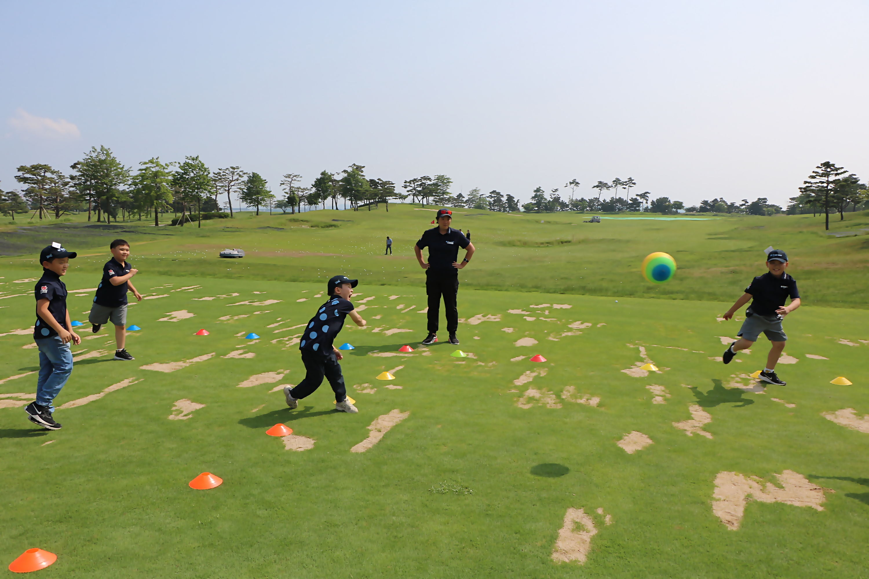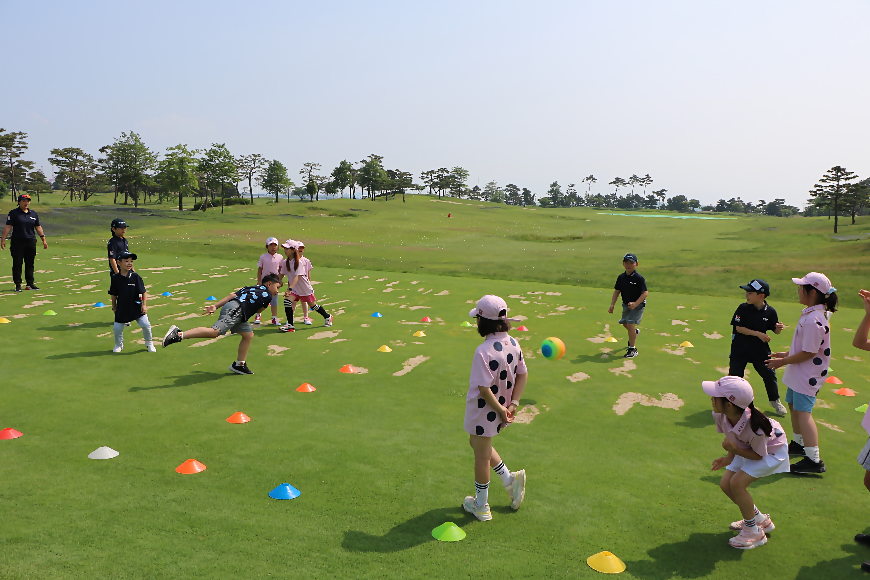 안전구로 피구를 하면서 가볍게 몸을 풀며 팀 단합의 중요성에 대해 배우고 있는 아이들