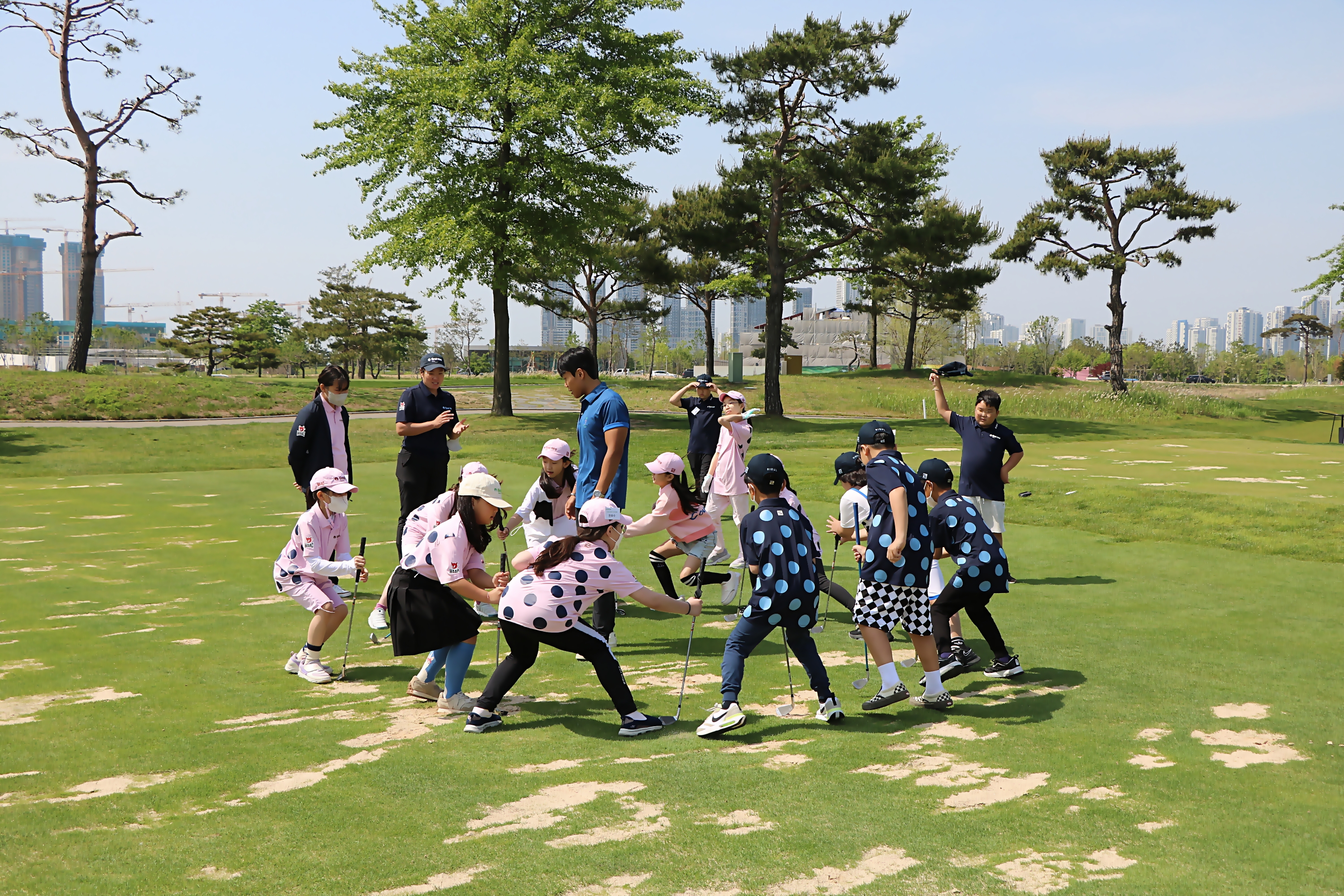 코치님의 신호에 맞춰 옆으로 이동하며 클럽을 쓰러뜨리지 않고 잡는 게임을 하면서 즐거워하는 아이들