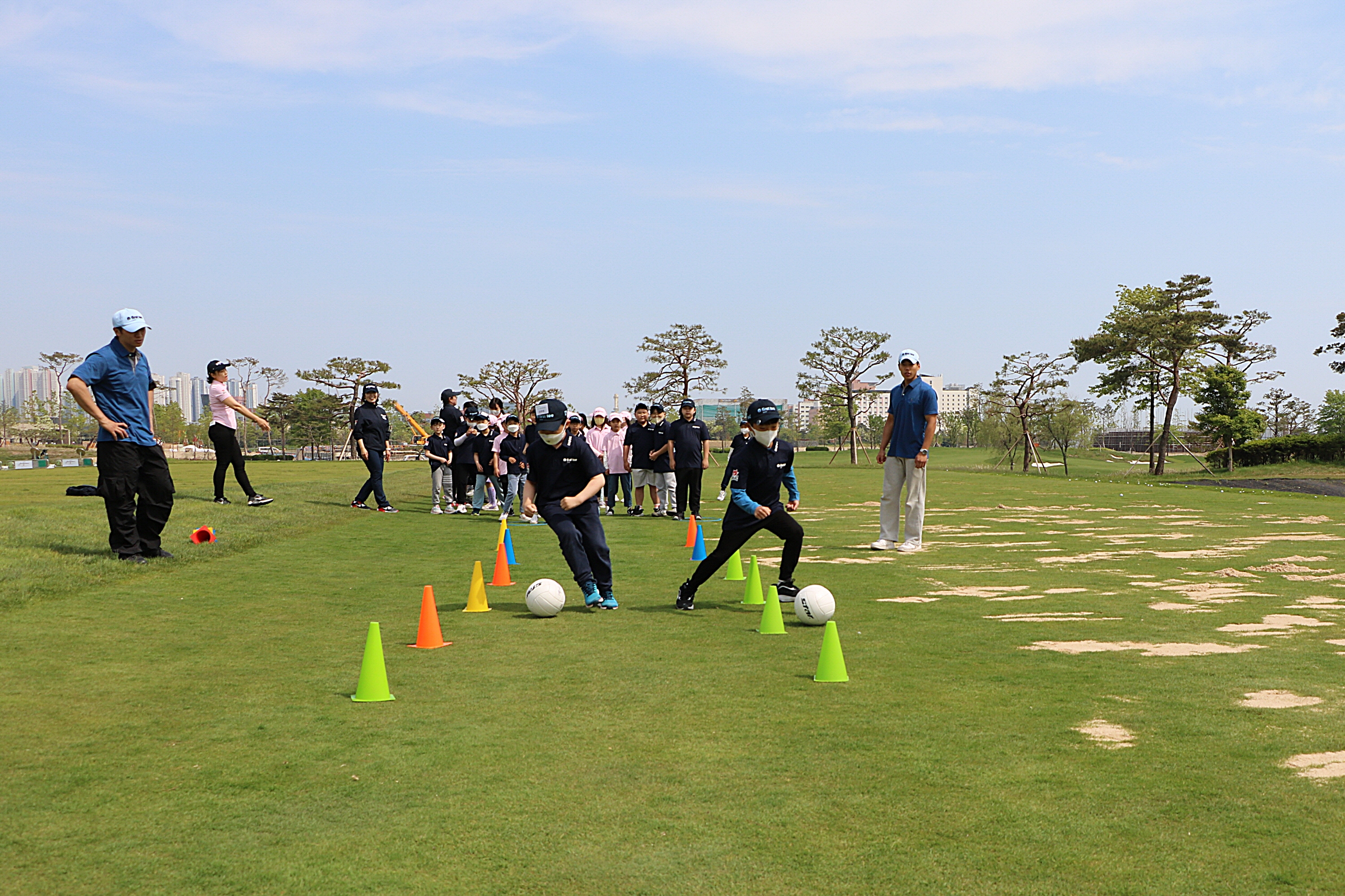 집중력을 키우기 위해 드리볼을 하며 장애물 통과를 하고 있는 아이들