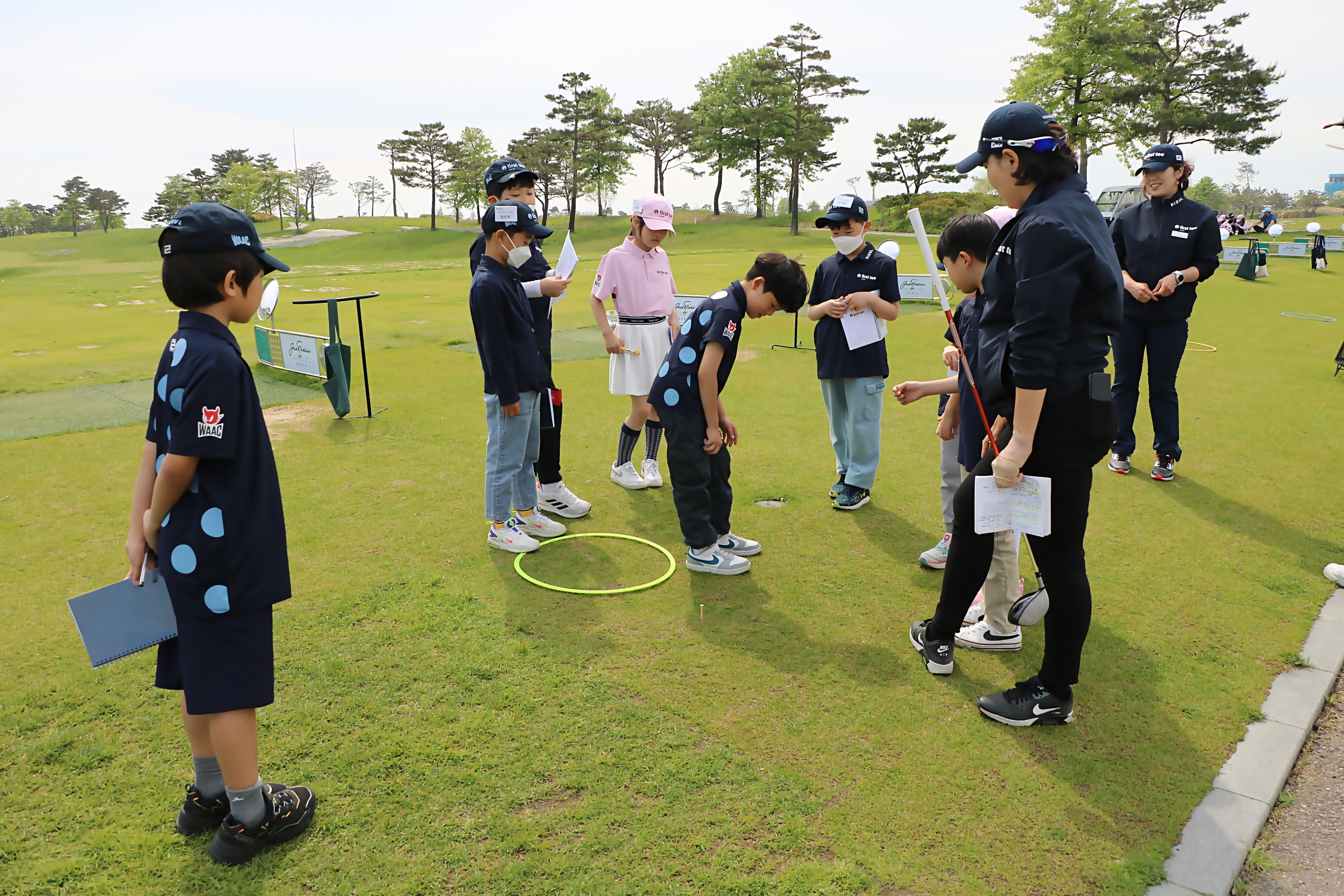 스프링쿨러에 자신이 친 볼이 들어갔을 때 처리하는 요령을 배운 뒤 실습해 보고 있는 아이들
