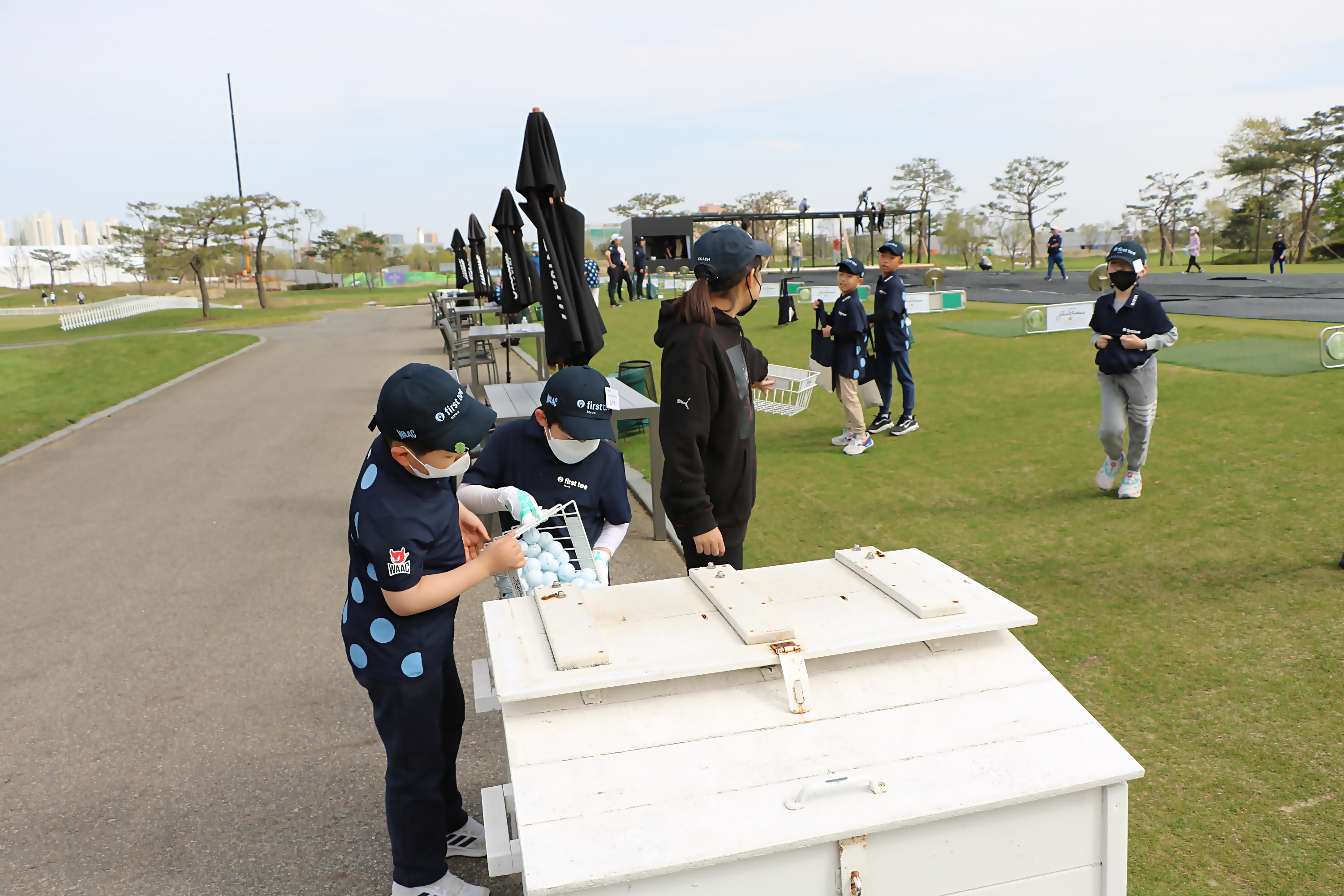 코스에 대한 책임감을 실천하기 위해 실습 마무리 후 자신들이 친 볼을 직접 수거해 볼수거함에 넣고 있는 모습