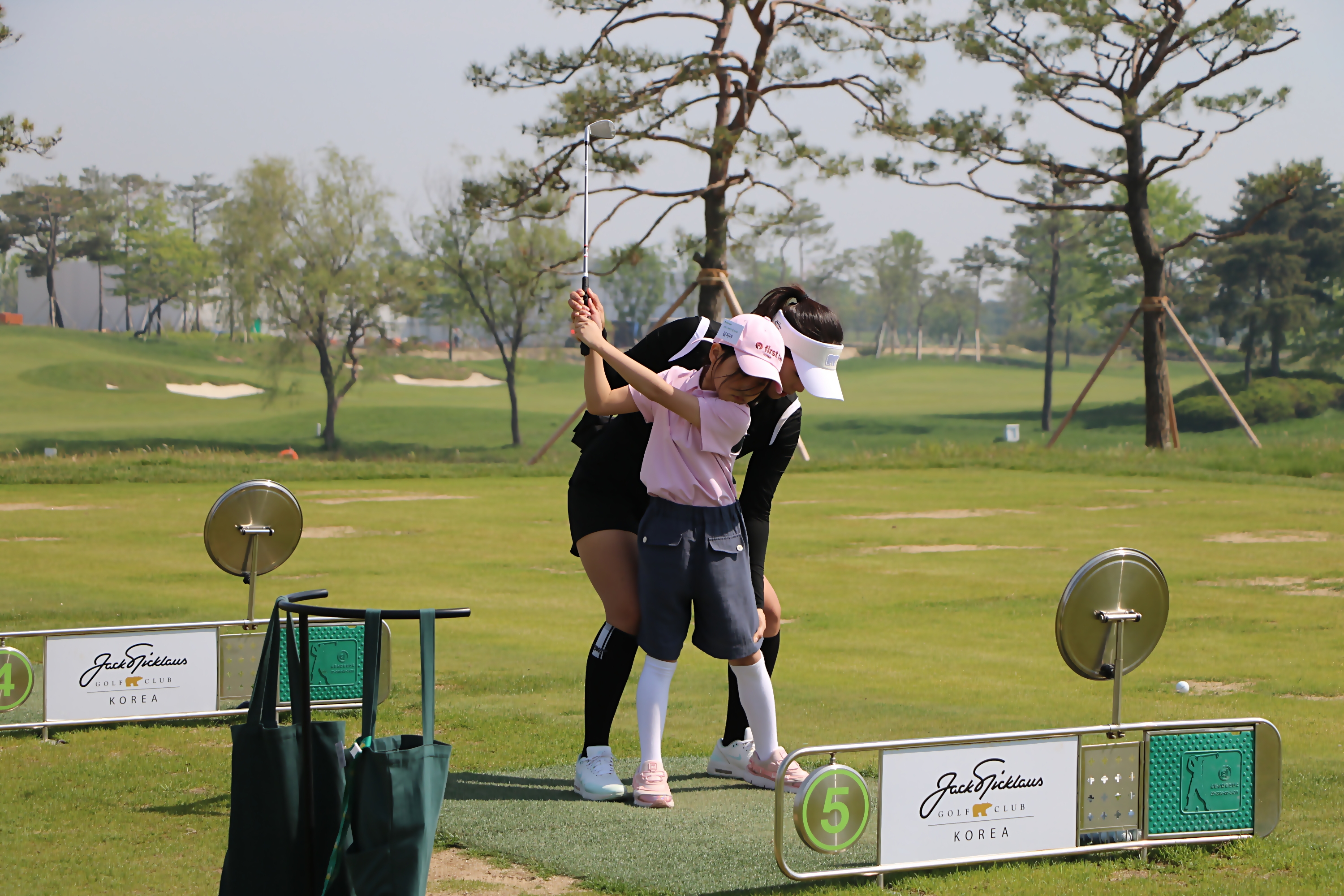 톱스윙시 하체가 왼쪽으로 밀리지 않도록 교정해 주고 있는 모습