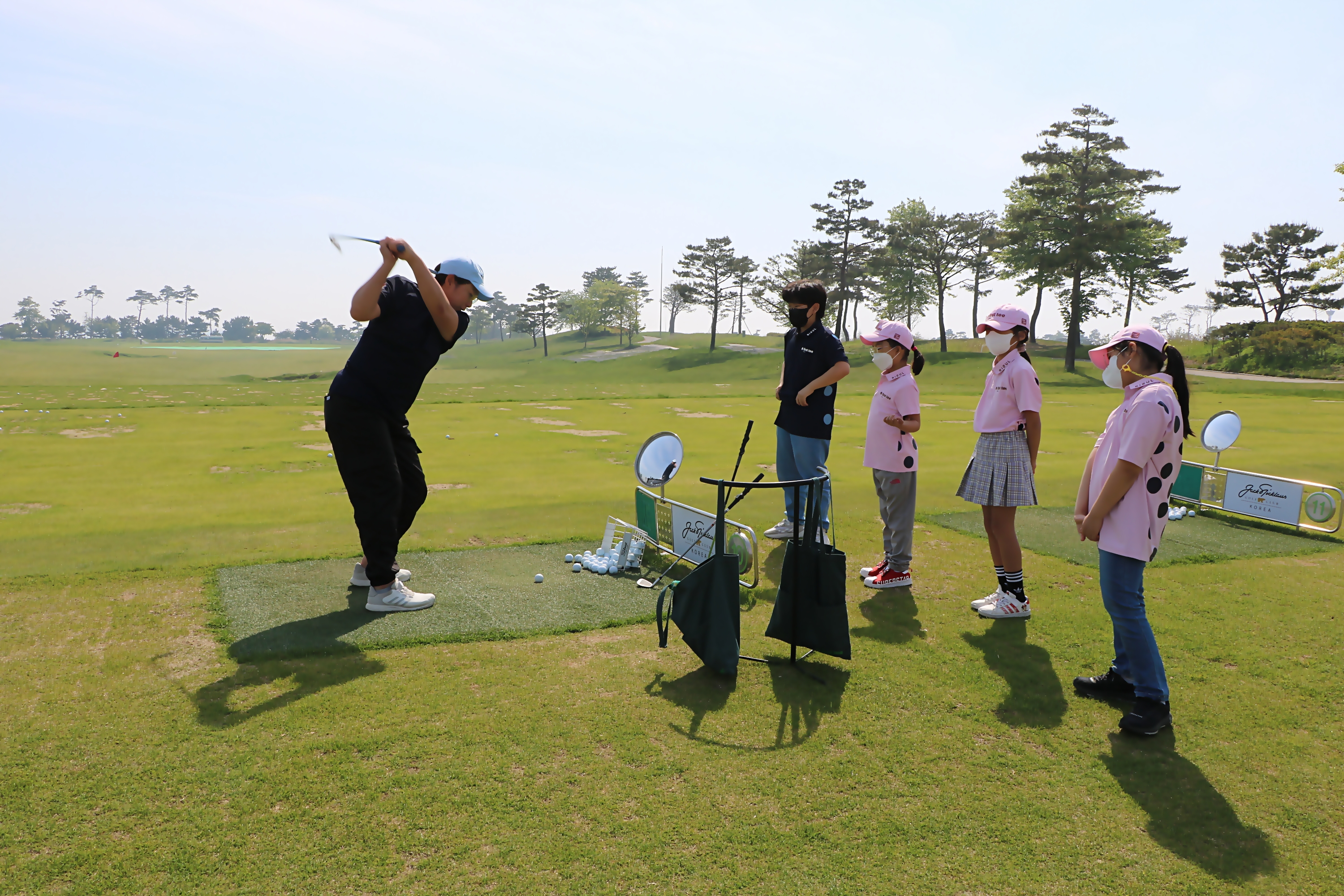 파레벨과 플레이어레벨 2단계 교육생을 대상으로 풀스윙 시범을 보여주고 있는 모습