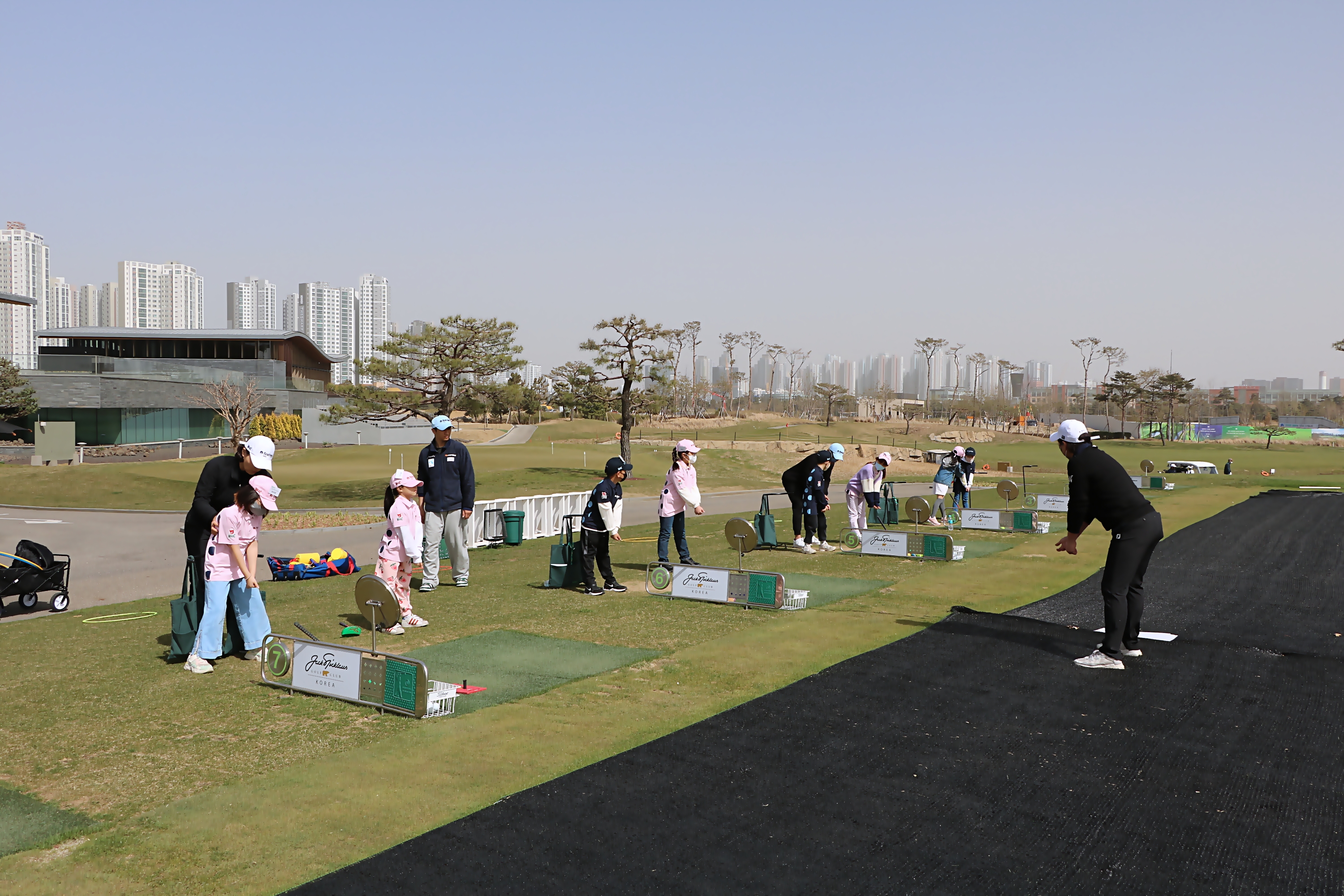 골프스윙의 기본 동작인 어드레스 자세에 대해서 배우고 있는 아이들