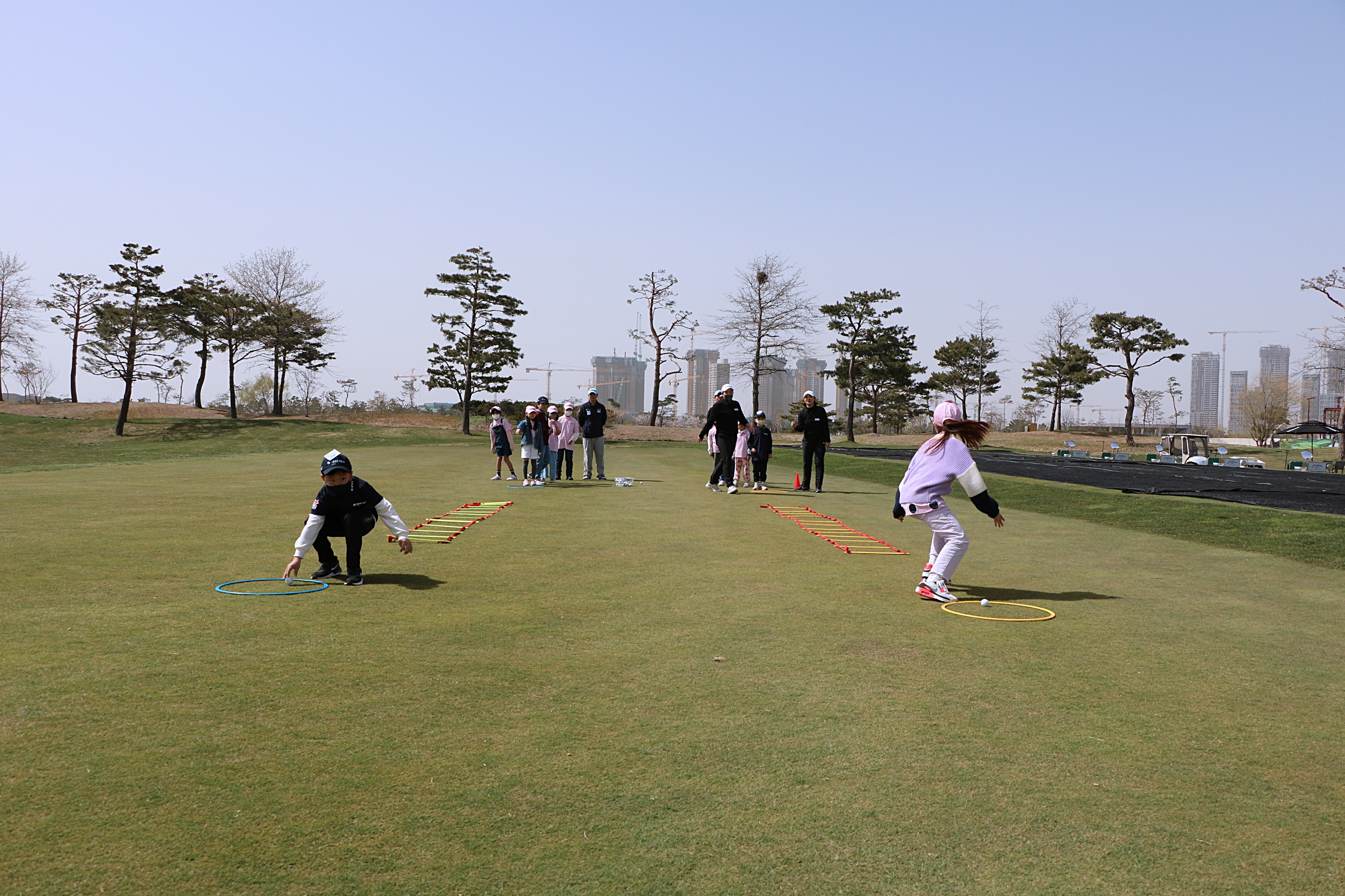 기찻길을 통과한 후 원 안에 골프공을 놓고 되돌아오기 시합을 하며 서로 협동심과 순발력을 기르고 있는 아이들