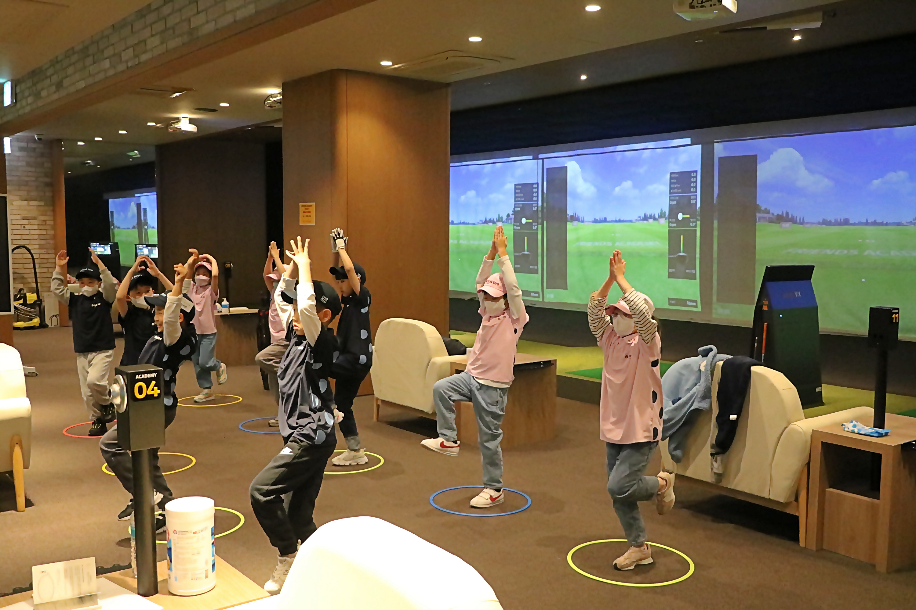 코치님을 따라 한발로 서기를 하며 균형감각을 익히고 있는 아이들