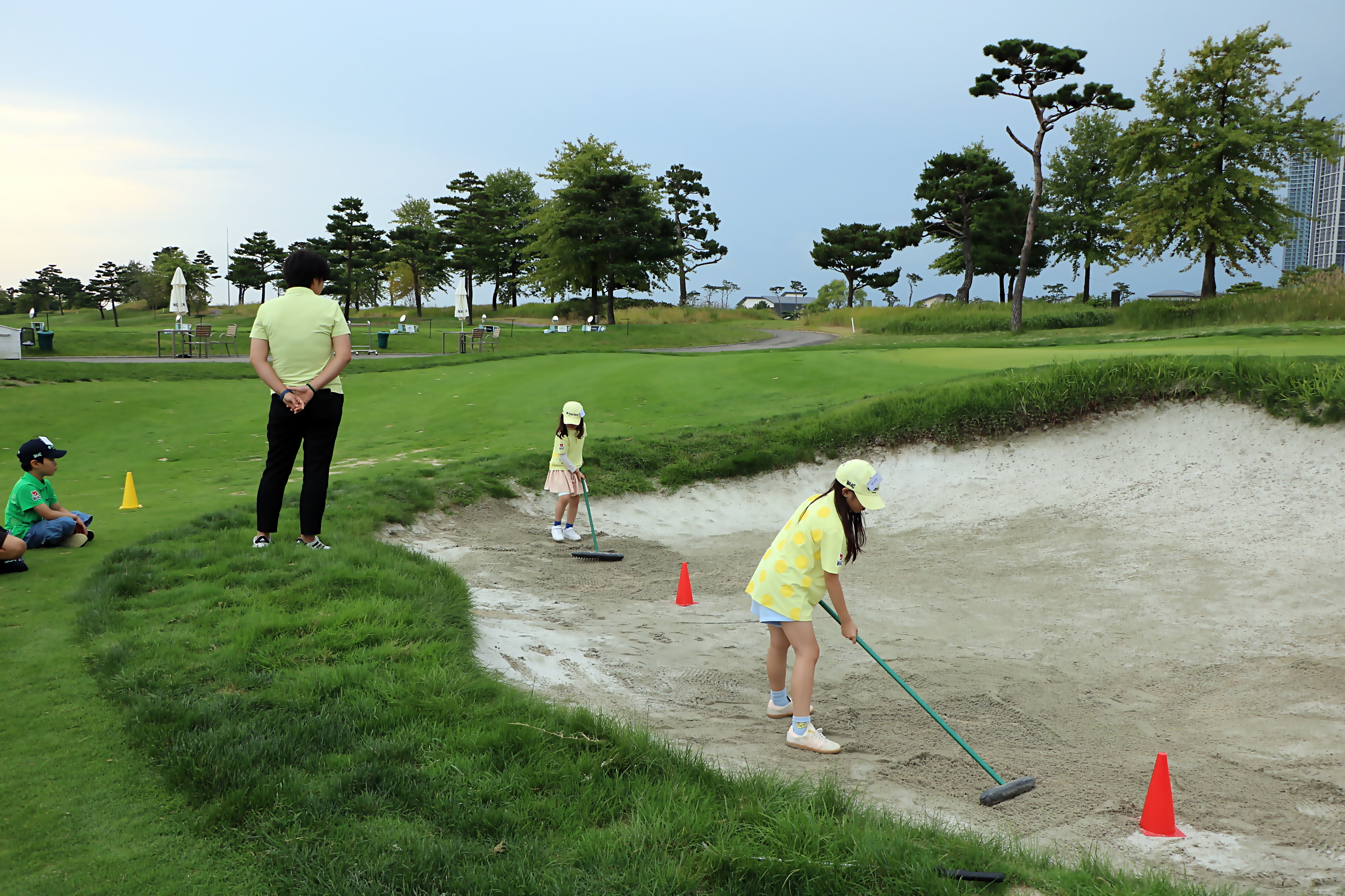 다음 사람을 위해 벙커샷 실습 후 벙커 내 모래를 정리하고 있는 아이들